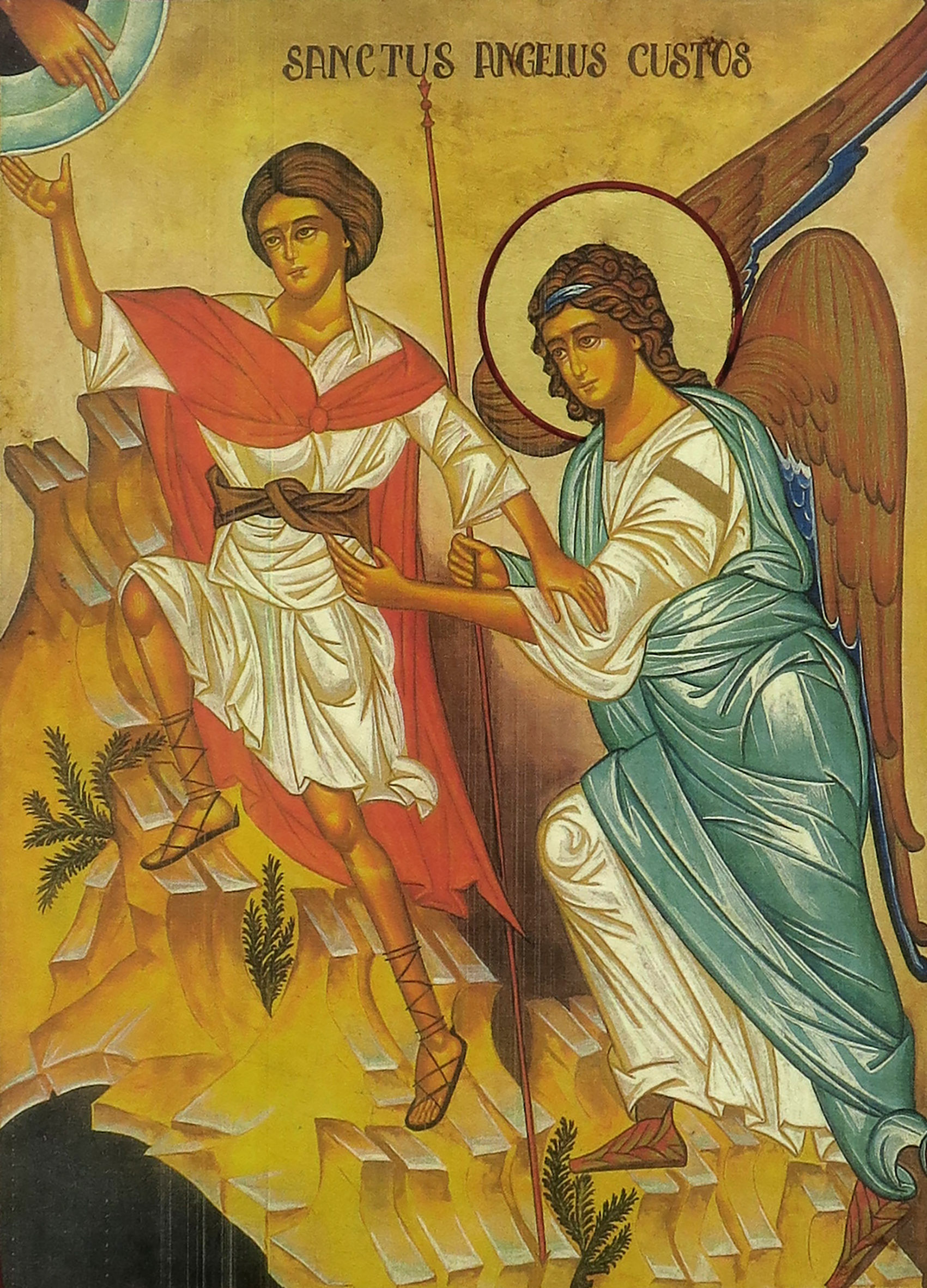 Icona da parete, di forma rettangolare, che raffigura l'Angelo Custode. Gli angeli sono figure molto ricorrenti nella Bibbia, sono inviati del Signore e hanno il compito di eseguire le sue volontà. Spesso, a loro è affidato il compito di proteggere e aiutare, come raffigurato in questa icona: l'angelo sorregge l'uomo nella salita della montagna, metafora dell'ascesa al cielo, resa difficoltosa dai rovi e insidiosa dalla voragine.