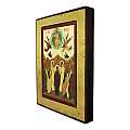 L'immagine è una fine litografia, incollata su legno e rifinita con foglia d'oro, mentre le aureole, le scritte e il contorno bordeaux sono realizzati a mano. Il bordo del quadretto è in rilievo con smussatura. Il gancio sul retro consente di appendere l'icona al muro.