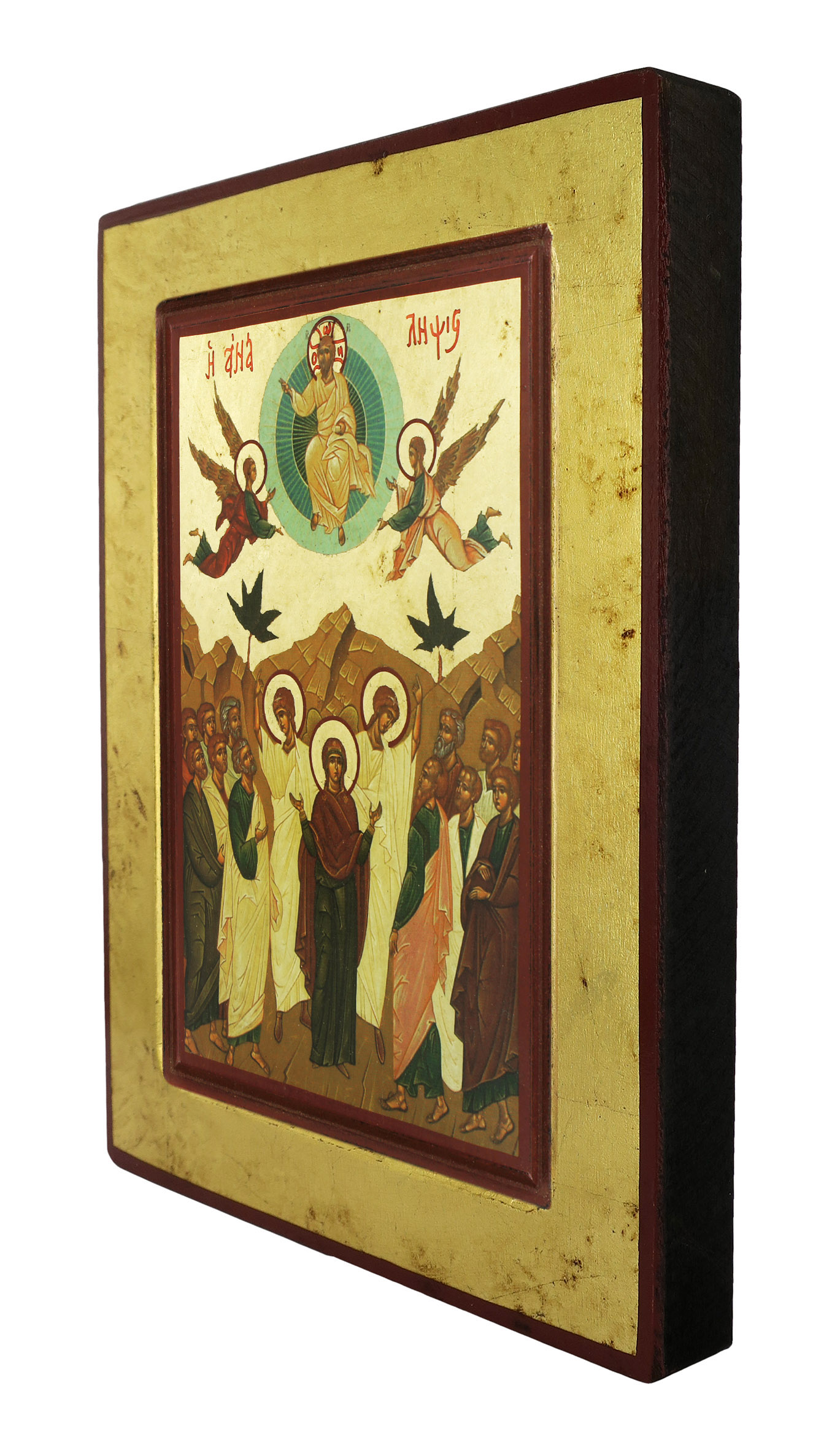 Icona Ascensione di Cristo, Icona in Stile Arte Bizantina, Icona su Legno Rifinita con Aureole, Scritte e Bordure Fatte a Mano, Produzione Greca - 26 x 19,5 Cm