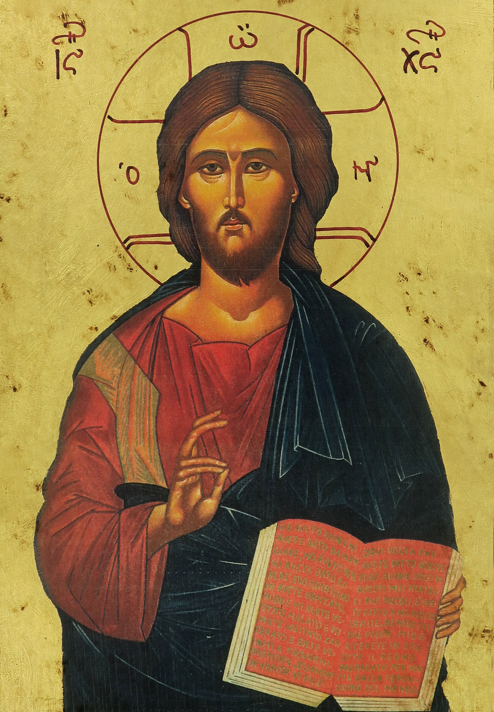 Icona Cristo Pantocratore con libro aperto, Icona in Stile Arte Bizantina, Icona su Legno Rifinita con Aureole, Scritte e Bordure Fatte a Mano, Produzione Greca - 25 x 19 Cm