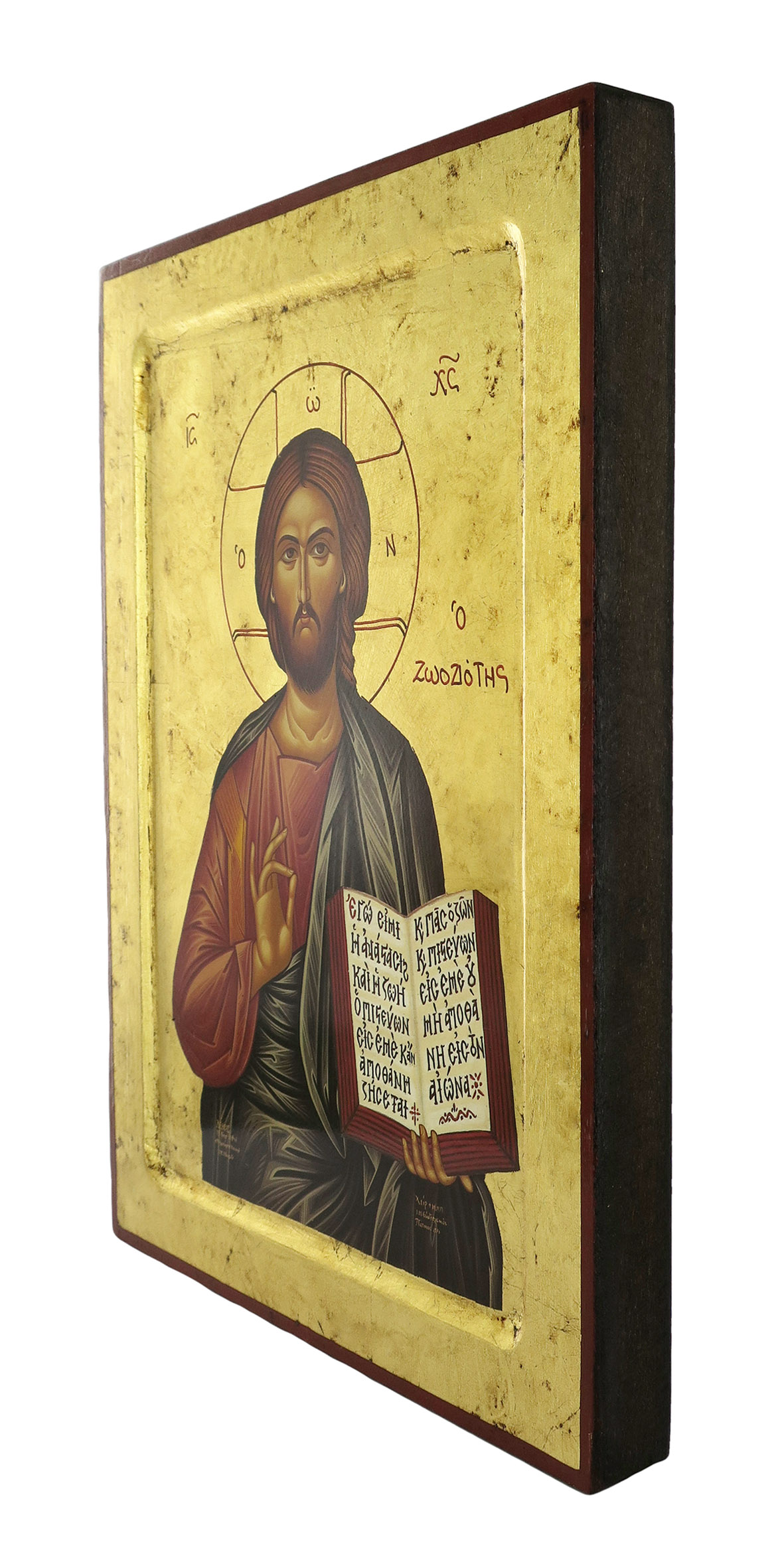 Icona Cristo Pantocratore con libro aperto, Icona in Stile Arte Bizantina, Icona su Legno Rifinita con Aureole, Scritte e Bordure Fatte a Mano, Produzione Greca - 31,5 x 24 Cm