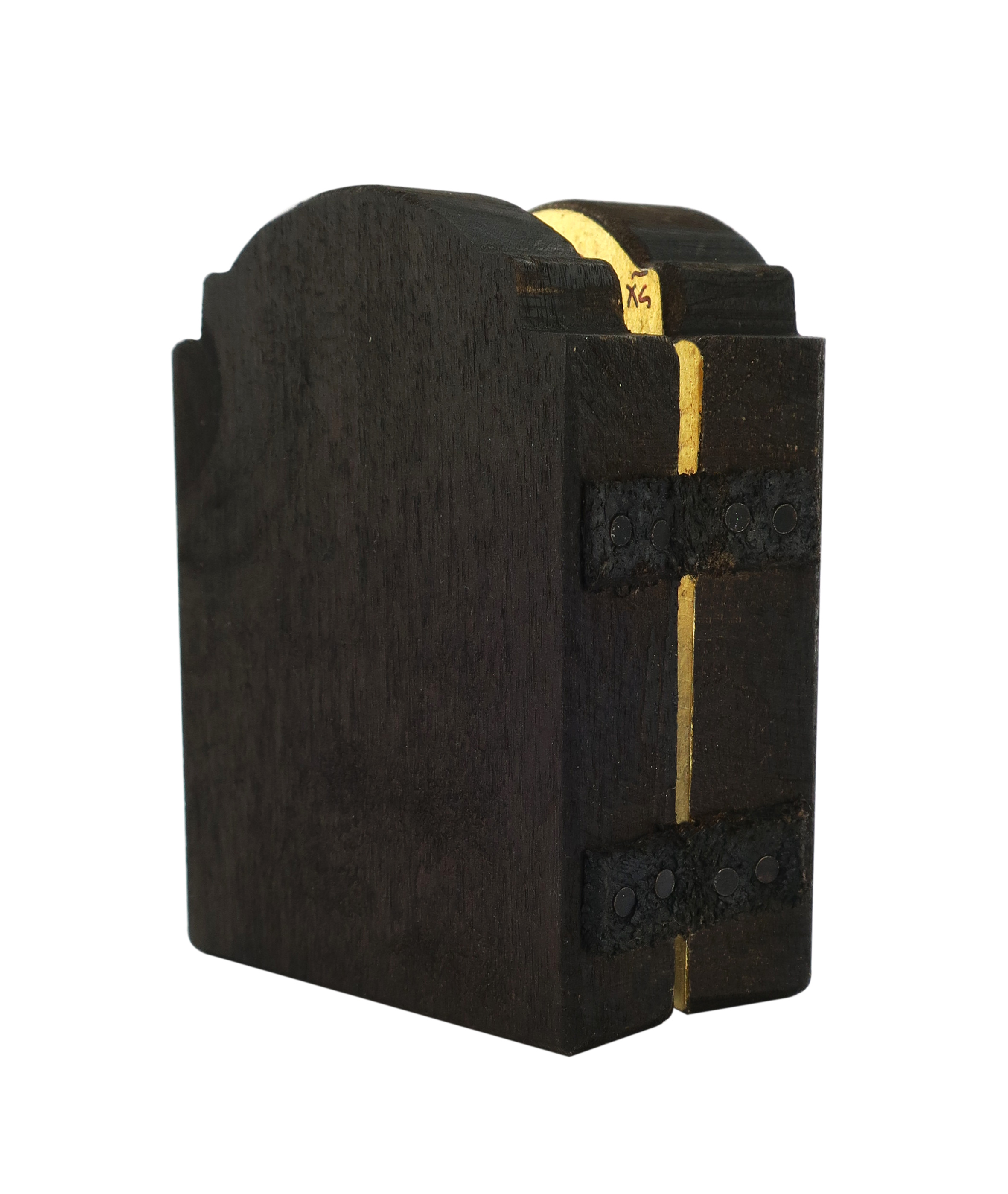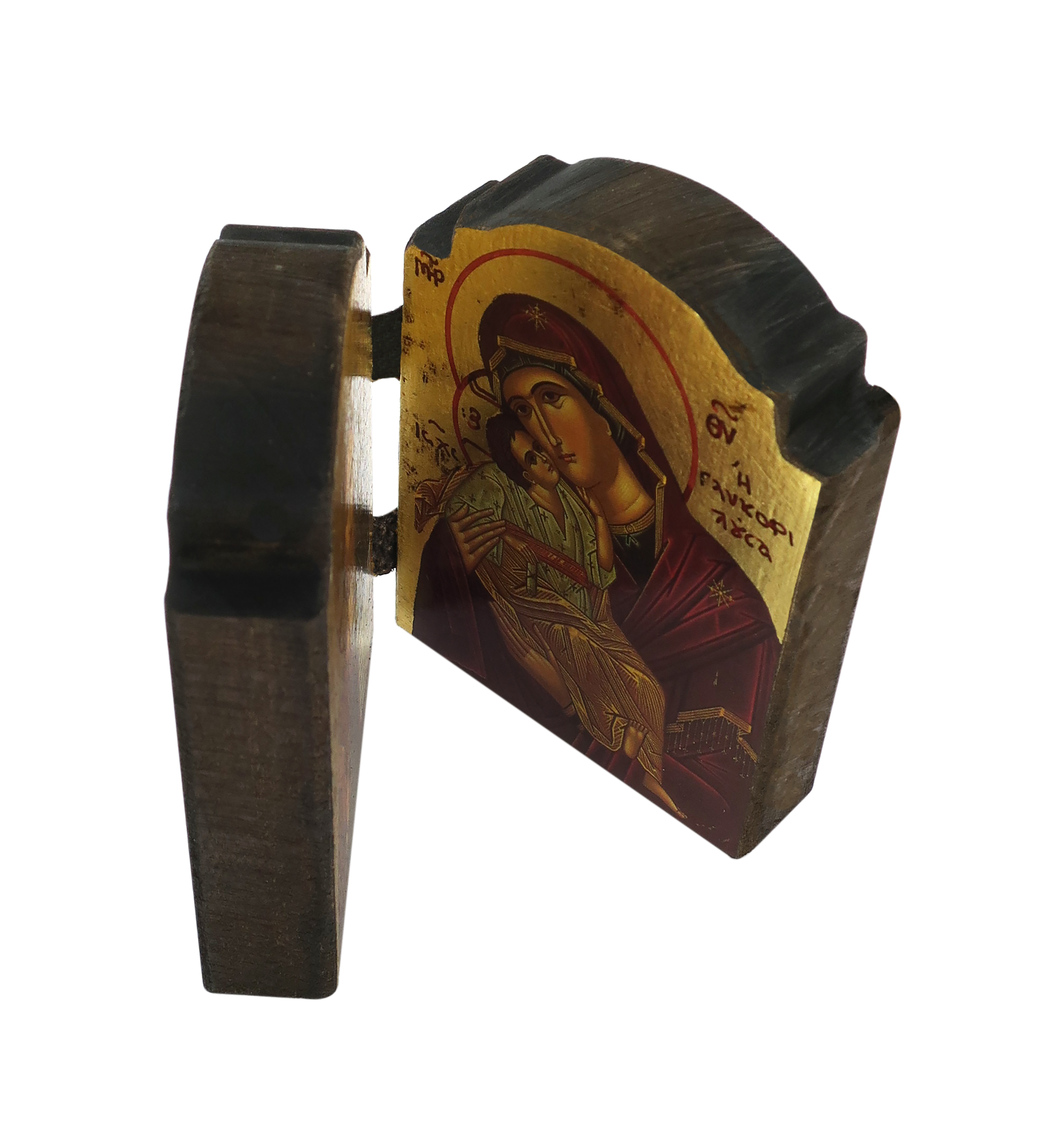 Icona dittico di medie dimensioni che raffigura la Vergine della Tenerezza di Vladimir (altrimenti detta "Theotókos di Vladimir") e il Cristo Pantocratore. Le immagini sono fini litografie incollate su legno e rifinite con foglia d'oro, mentre le aureole, le scritte e i bordi sono realizzati a mano. La parte superiore dei pannelli, dalla linea arrotondata, è abbellita da dolci smussature.