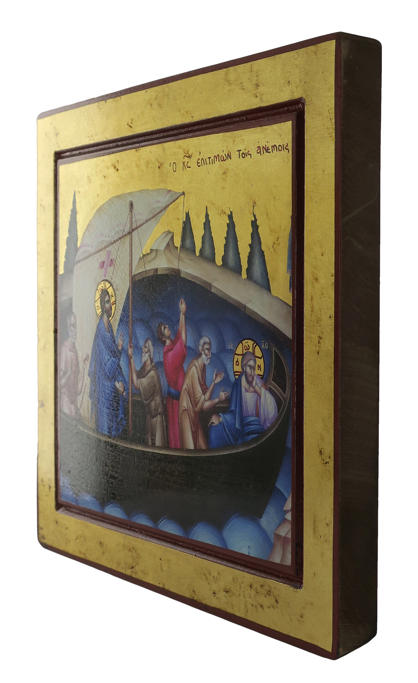 L'immagine della tempesta sedata è una litografia incollata su legno e rifinita con foglia d'oro, mentre le aureole e i bordi sono realizzati a mano. Il contorno interno, incassato, divide la rappresentazione centrale dal bordo, che diventa una cornice. Il gancio sul retro consente di appendere la grande icona al muro.