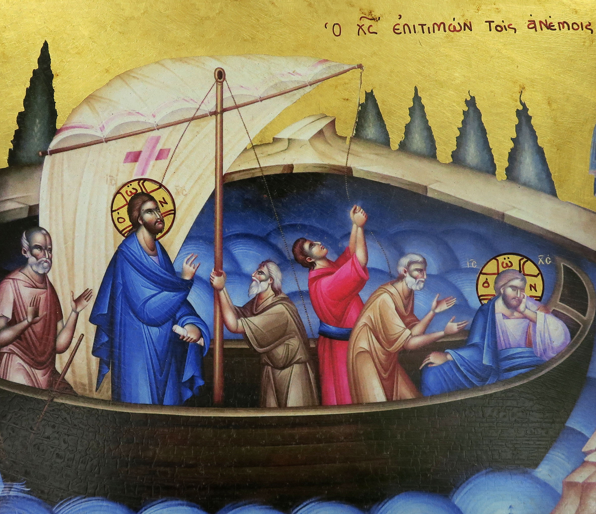 Grande icona da parete che raffigura Gesù coi Discepoli nel noto episodio della tempesta sedata. Vicenda narrata nei vangeli di Marco, Matteo e Luca, la burrasca sul lago dimostra il dominio del Signore sulla natura: Gesù, in compagnia dei suoi discepoli sulla barca, doma la tempesta nel mar di Galilea e li aiuta a superare la difficile situazione.