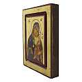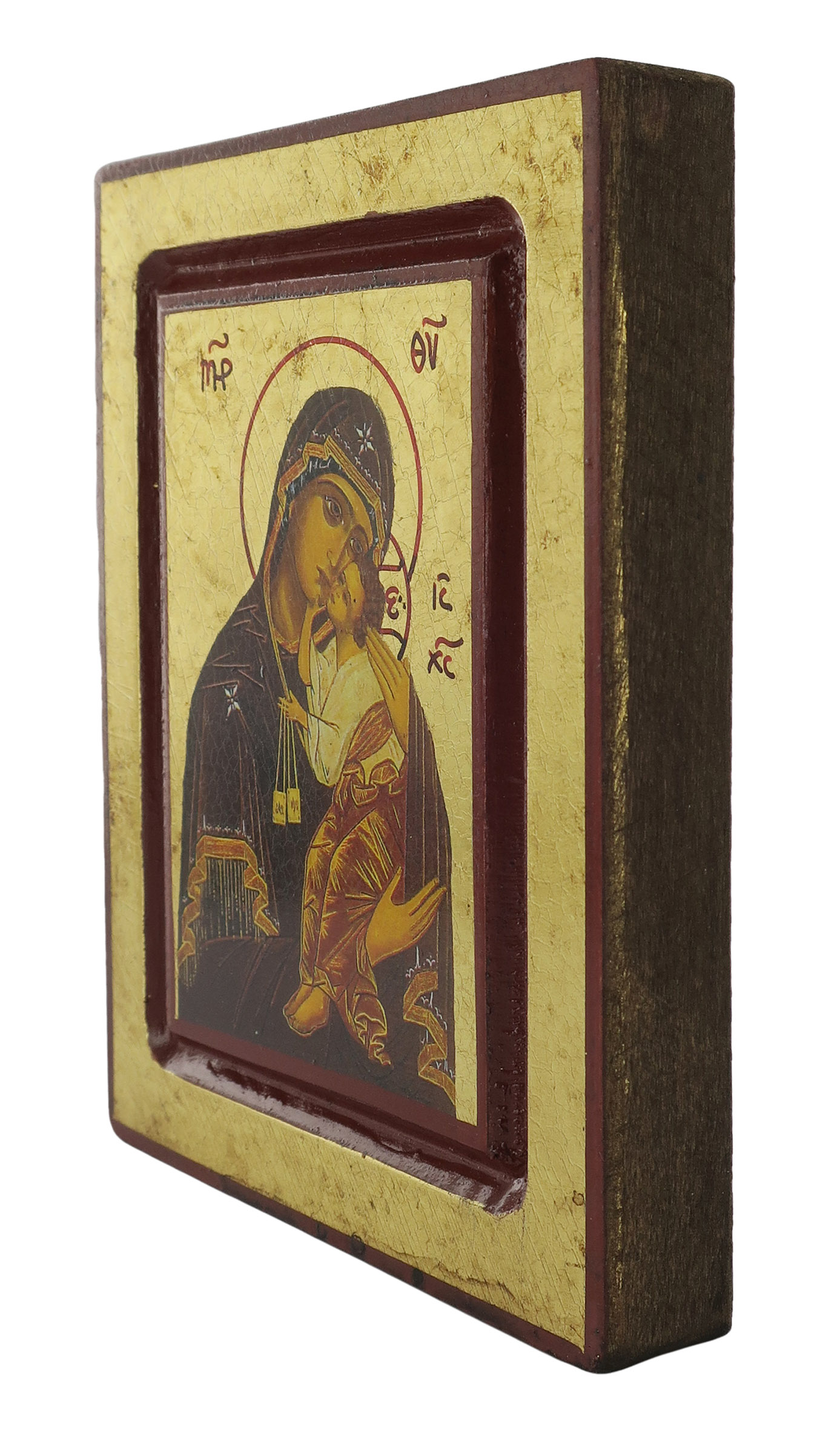 L'immagine è una fine litografia incollata su legno e rifinita con foglia d'oro, mentre le aureole, le scritte e i bordi sono realizzati a mano. Grazie al bordo interno incassato di colore bordeaux, che dona ulteriore risalto ai soggetti, quello esterno spicca, fungendo da cornice alla rappresentazione. Un delicato effetto anticato dona all'oggetto ulteriore pregio. Il gancio sul retro consente di appendere l'icona al muro.
