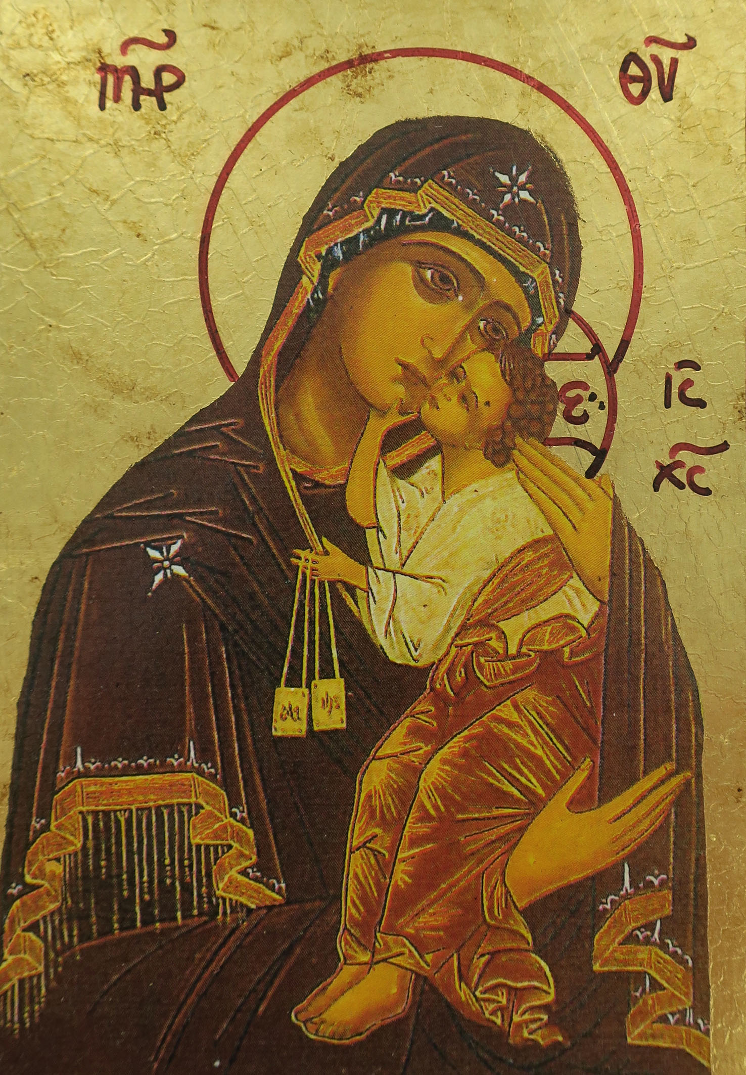 Icona da parete che raffigura la Madonna del Carmine. Si tratta della Madonna apparsa, insieme al Bambino, al beato Simone Stock il giorno 16 luglio 1251 sul promontorio dell’Alta Galilea, durante la quale la donna donò al santo lo scapolare con il “privilegio sabatino” (promessa di salvezza), annunciandogli che chiunque l'avrebbe indossato nel momento della morte avrebbe evitato le pene del Purgatorio.