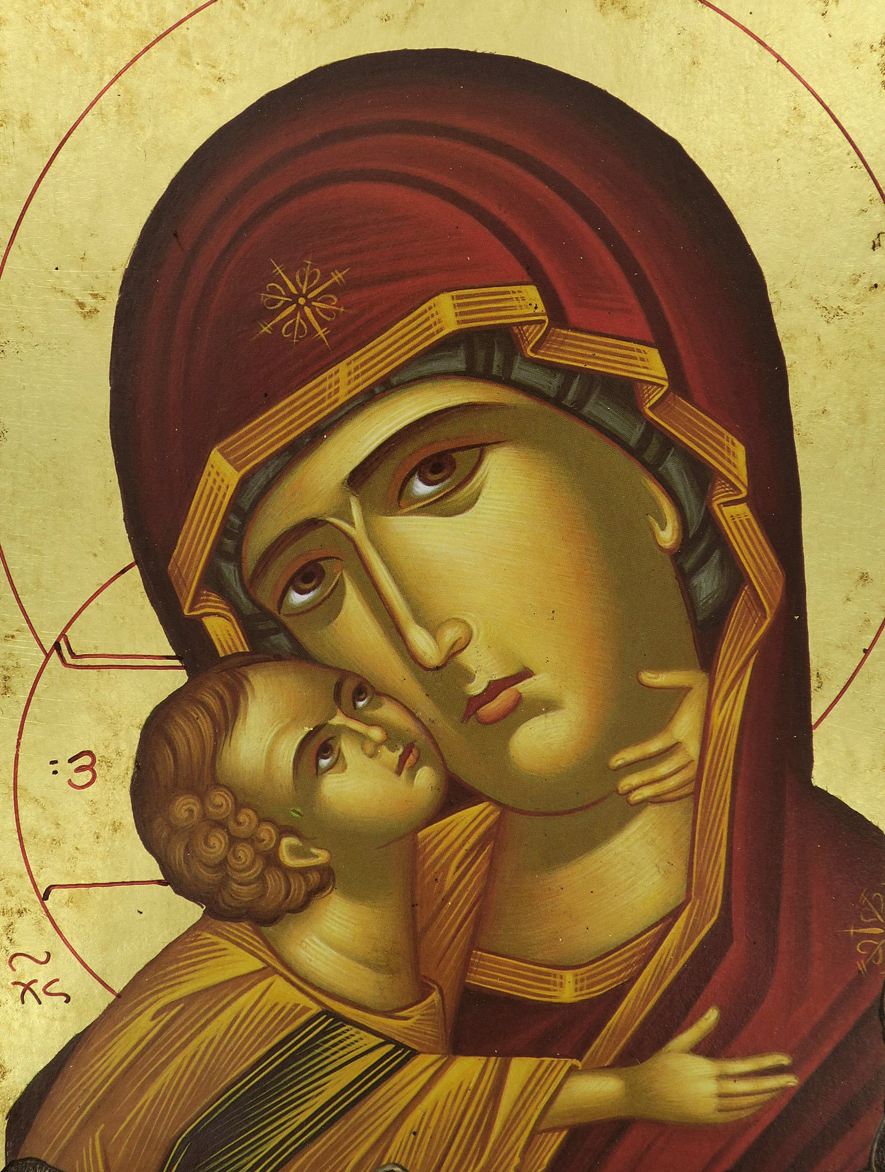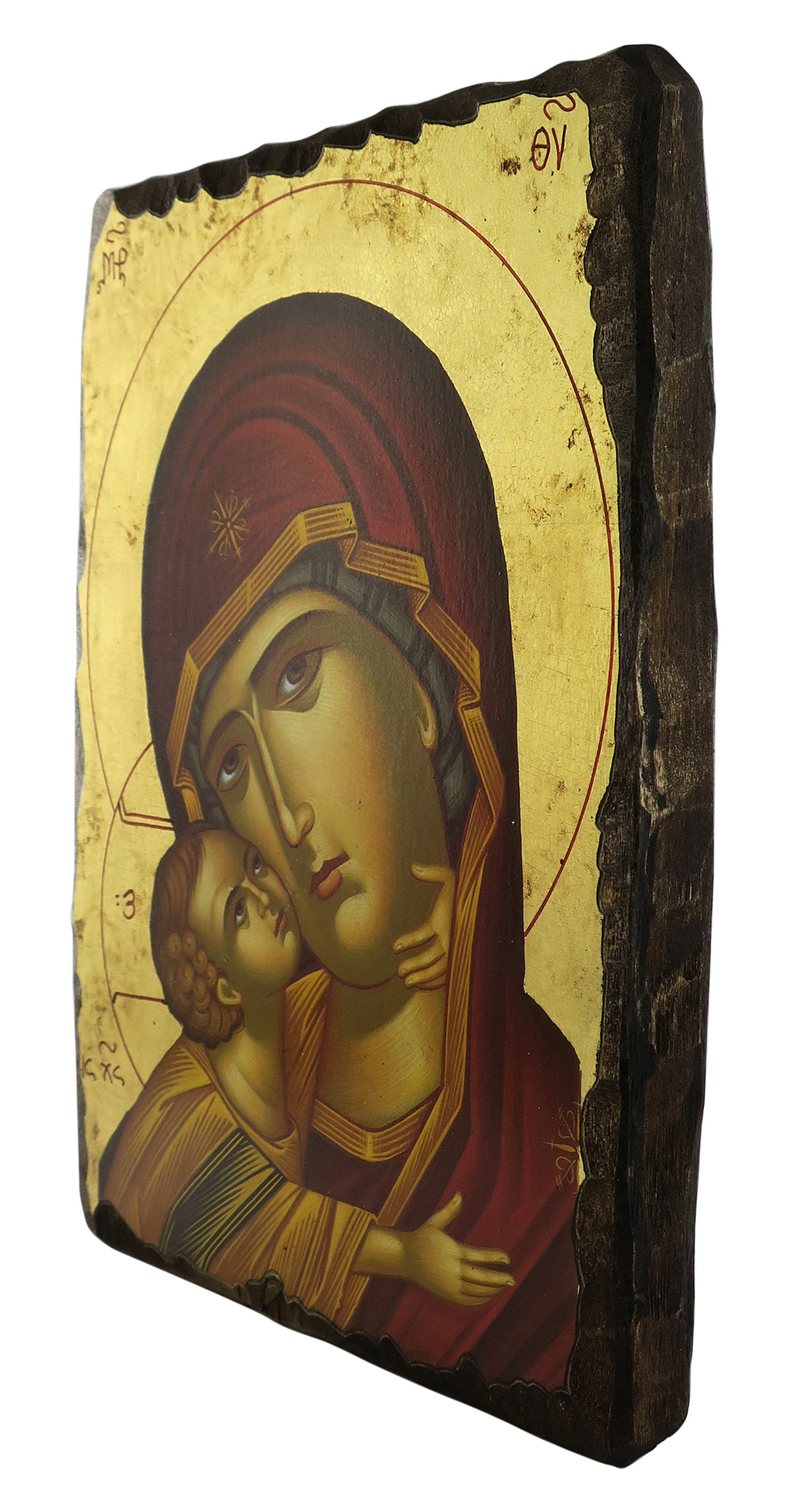 Icona da parete, di forma rettangolare, che raffigura la Vergine della Tenerezza di Vladimir (altrimenti detta "Theotókos di Vladimir"). Si tratta di una copia d'arte bizantina: l'icona originale della Madre di Dio della Tenerezza, a cui questa riproduzione si ispira, fu dipinta a Costantinopoli nel XII secolo ed è conservata a Mosca. Tra le icone ortodosse più venerate al mondo, la Theotókos ("Madre di Dio" in greco) è la figura protettrice della Russia.