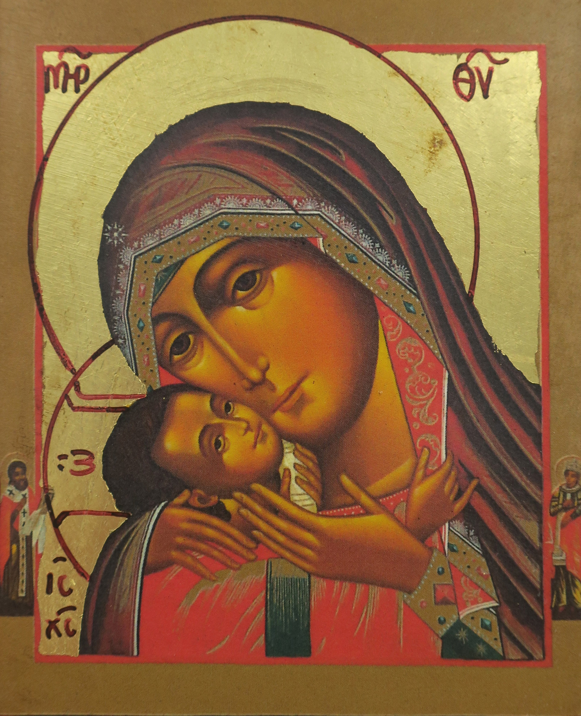 L'immagine della Vergine di Korsun è una fine litografia incollata su legno e rifinita con foglia d'oro, mentre le aureole, le scritte e i bordi sono realizzati a mano. Il contorno interno del quadretto è incassato, dividendo l'immagine centrale dal bordo esterno, che appare come una cornice. Lo sfondo, di color oro, dona ulteriore risalto ai soggetti della rappresentazione. Le scritte includono "MΡ ΘΥ" (Meter Theou = Madre di Dio) e il cristogramma "IC XC". Il gancio sul retro consente di appendere questa icona al muro.