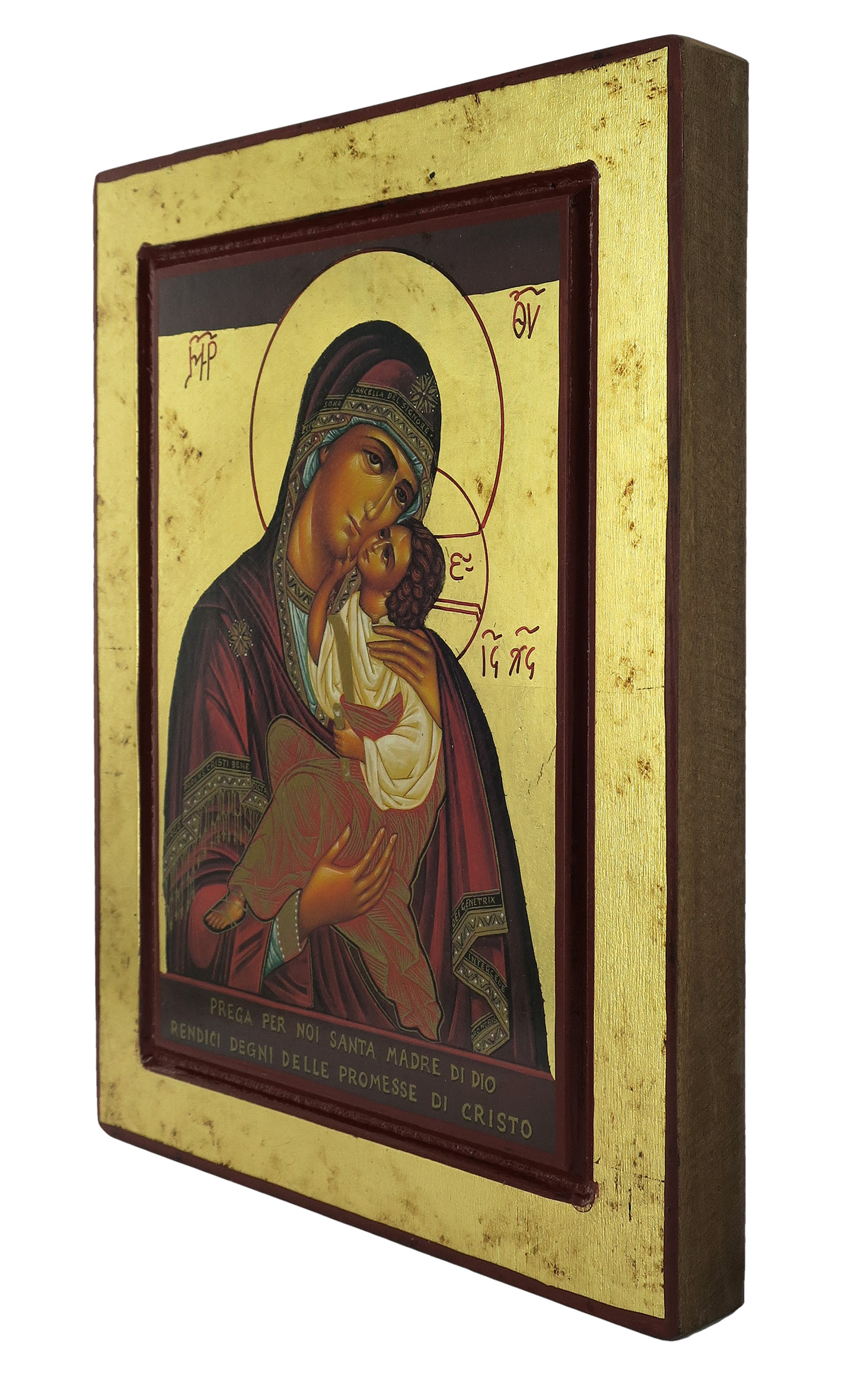Icona Madonna di Sofronov (Madre di Dio della Tenerezza), Icona in Stile Arte Bizantina, Icona su Legno Rifinita con Aureole, Scritte e Bordure Fatte a Mano, Produzione Greca - 25,5 x 19,5 Cm