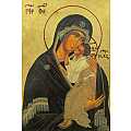 Icona Madre di Dio di Jaroslav, Icona in Stile Arte Bizantina, Icona su Legno Rifinita con Aureole, Scritte e Bordure Fatte a Mano, Produzione Greca - 15,5 x 12 Cm