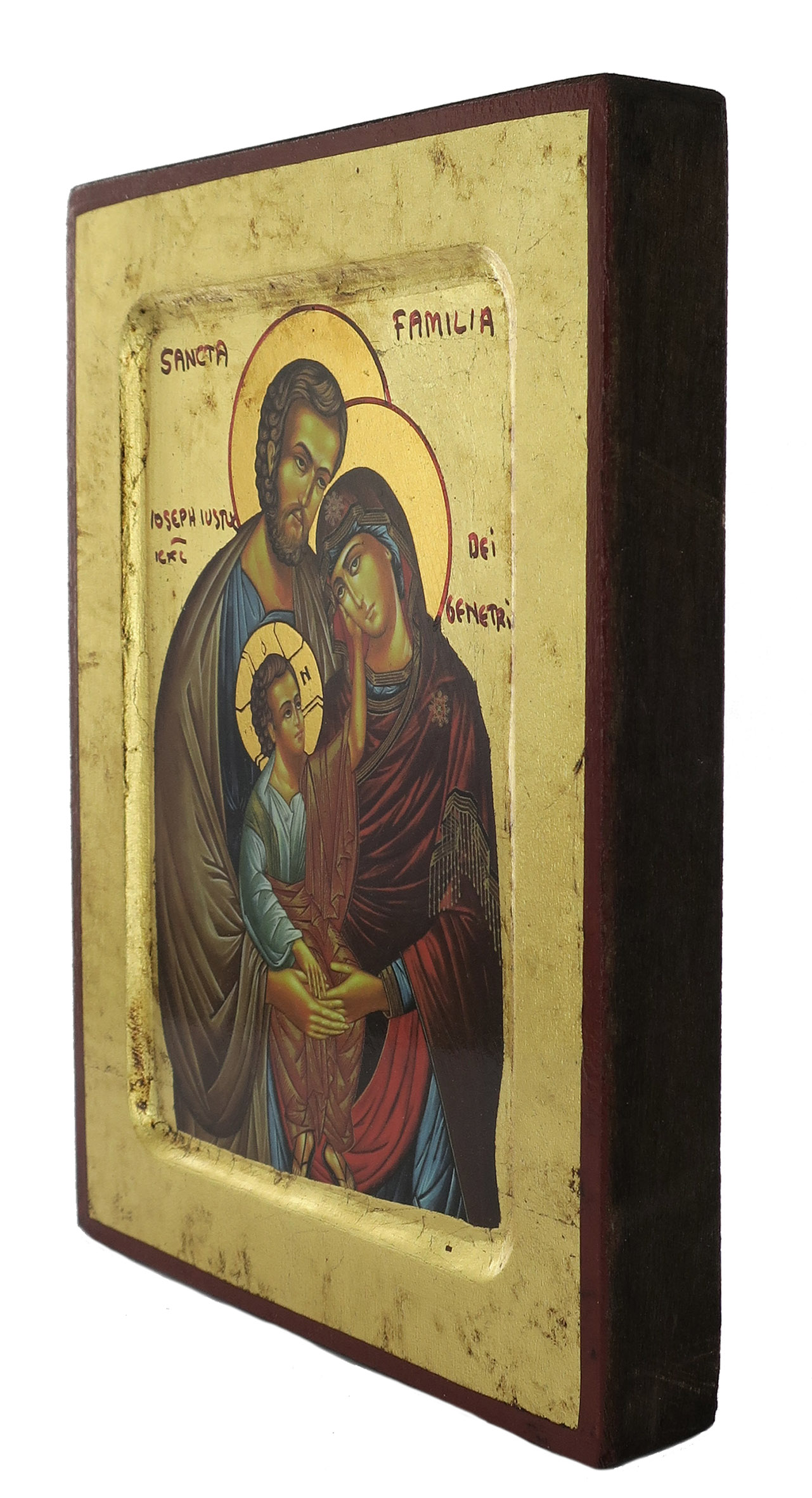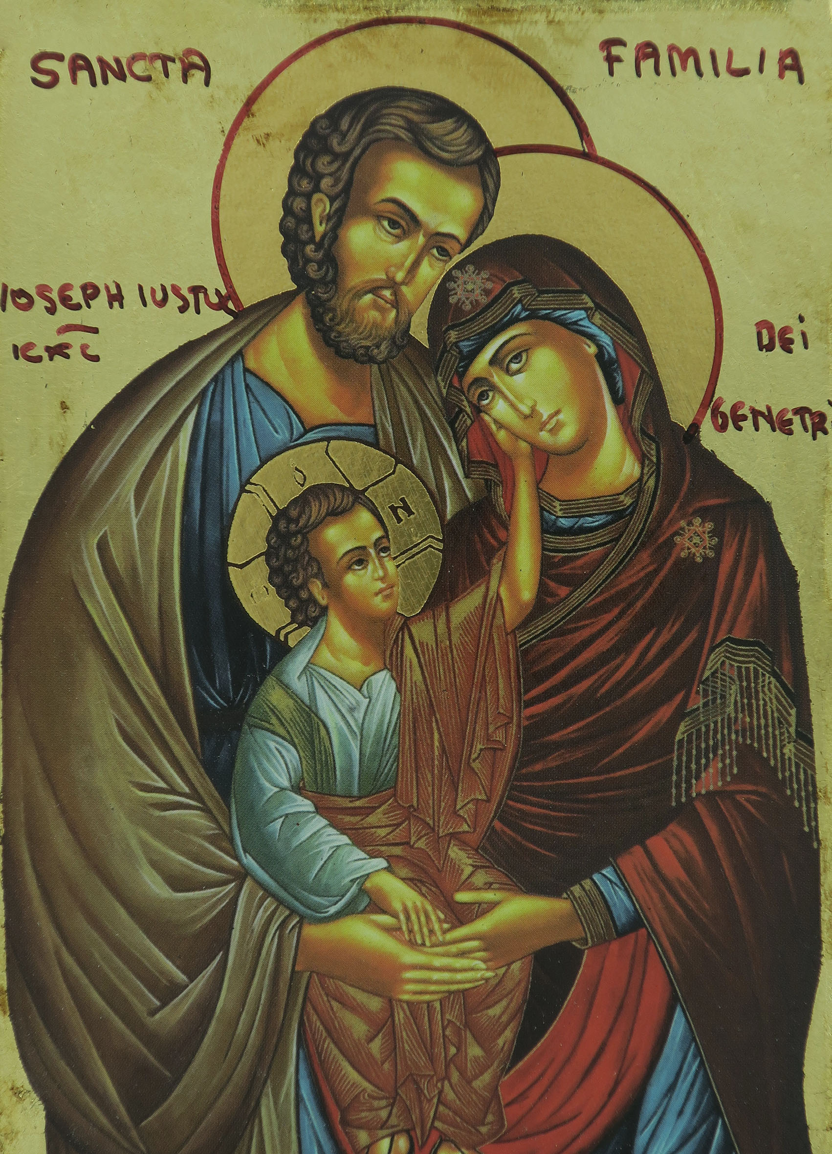 Icona da parete che raffigura la Sacra Famiglia. Si tratta di una copia d'arte bizantina: l'immagine è una fine litografia incollata su legno e rifinita con foglia d'oro, mentre le aureole, le scritte e i bordi sono realizzati a mano. il bordo in rilievo, smussato, fa da cornice alla rappresentazione. Il gancio sul retro consente di appendere l'icona alla parete.