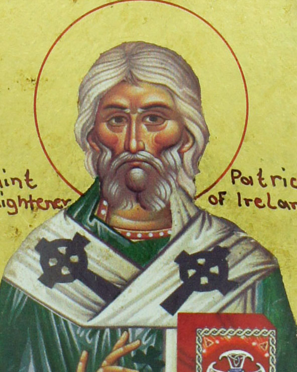 Icona da parete raffigurante San Patrizio (Saint Patrick), figura molto popolare della cristianità irlandese e santo patrono d'Irlanda, di Boston e di New York, celebrato in tutto il mondo il 17 marzo. S. Patrizio, considerato l'Evangelizzatore dell'Irlanda, è qui rappresentato in vesti di color verde, tiene in mano il simbolico trifoglio (elemento da lui adottato per spiegare il concetto di Trinità durante la sua opera di evangelizzazione) ed è definito con l'iscrizione "Enlightener of Ireland". Nella mano sinistra tiene, invece, il libro delle Sacre Scritture, simbolo della parola del Signore da lui professata.
