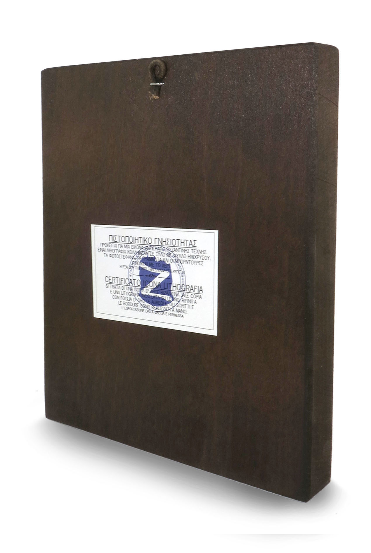 Il retro reca una certificazione che attesta le caratteristiche produttive di questa icona, realizzata in Grecia.