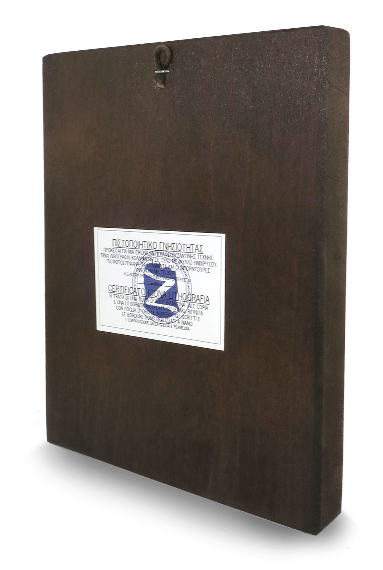 Il retro reca una certificazione che attesta le caratteristiche produttive di questa icona, realizzata in Grecia.