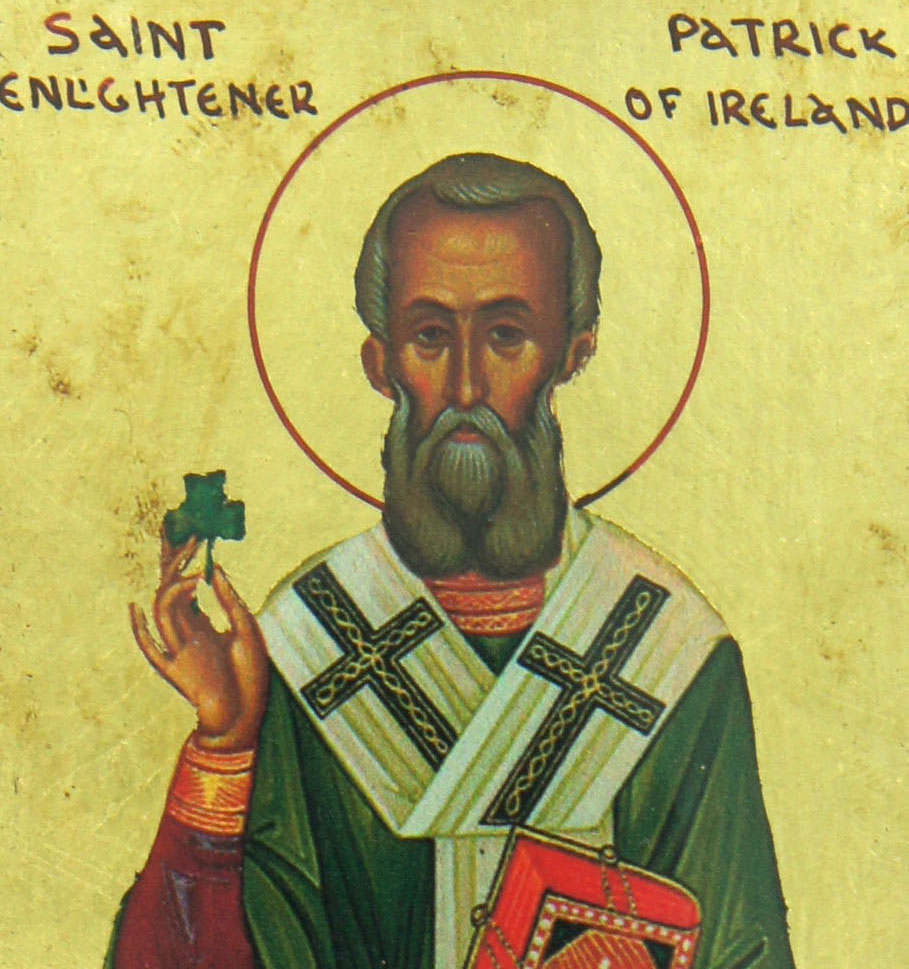 Icona da parete con bordo rosso, raffigurante San Patrizio (Saint Patrick), figura molto popolare della cristianità irlandese e santo patrono d'Irlanda, di Boston e di New York, celebrato in tutto il mondo il 17 marzo. S. Patrizio, considerato l'Evangelizzatore dell'Irlanda, è qui rappresentato in vesti di color verde, tiene in mano il simbolico trifoglio (elemento da lui adottato per spiegare il concetto di Trinità durante la sua opera di evangelizzazione) ed è definito con l'iscrizione "Enlightener of Ireland". Nella mano sinistra tiene, invece, il libro delle Sacre Scritture, simbolo della parola del Signore da lui professata.