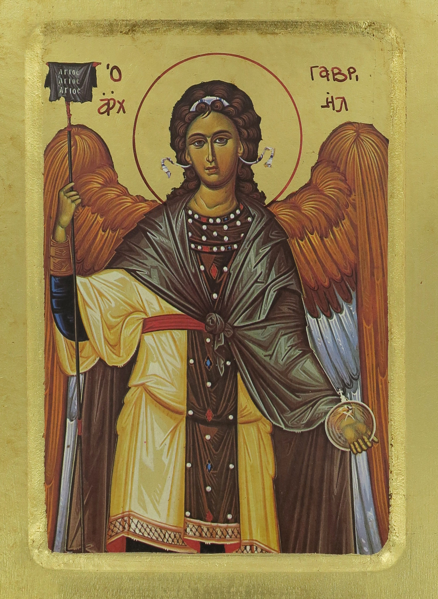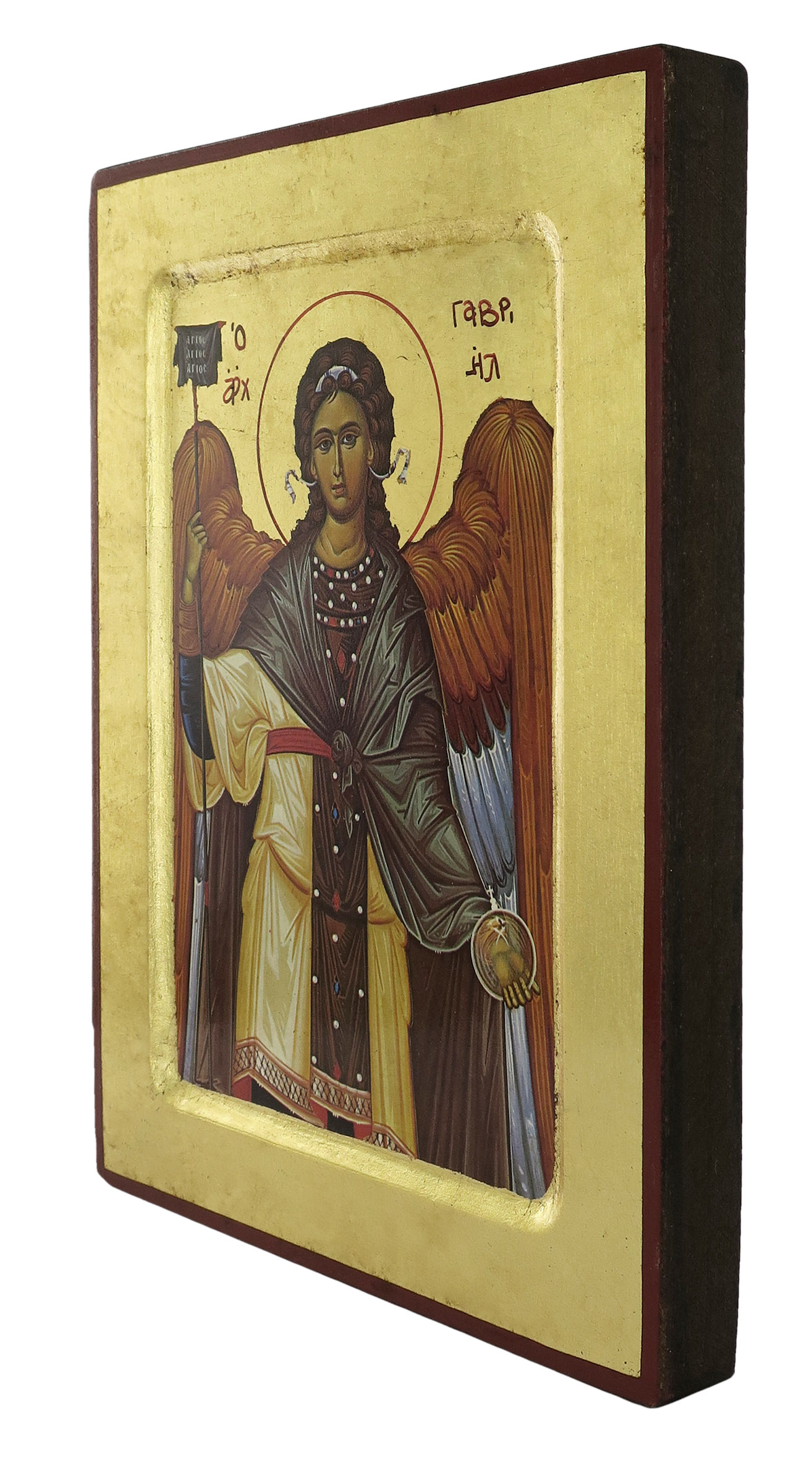 Icona da parete, di forma rettangolare, che raffigura San Gabriele, l'Arcangelo messaggero che diede l'annuncio dell'Incarnazione del Figlio di Dio alla Vergine Maria, con le parole «Rallégrati, piena di grazia: il Signore è con te [...]. Ed ecco, concepirai un figlio, lo darai alla luce e lo chiamerai Gesù. Sarà grande e verrà chiamato Figlio dell'Altissimo». S. Gabriele Arcangelo è celebrato il 29 settembre ed è patrono di ambasciatori, corrieri, giornalai e postini.