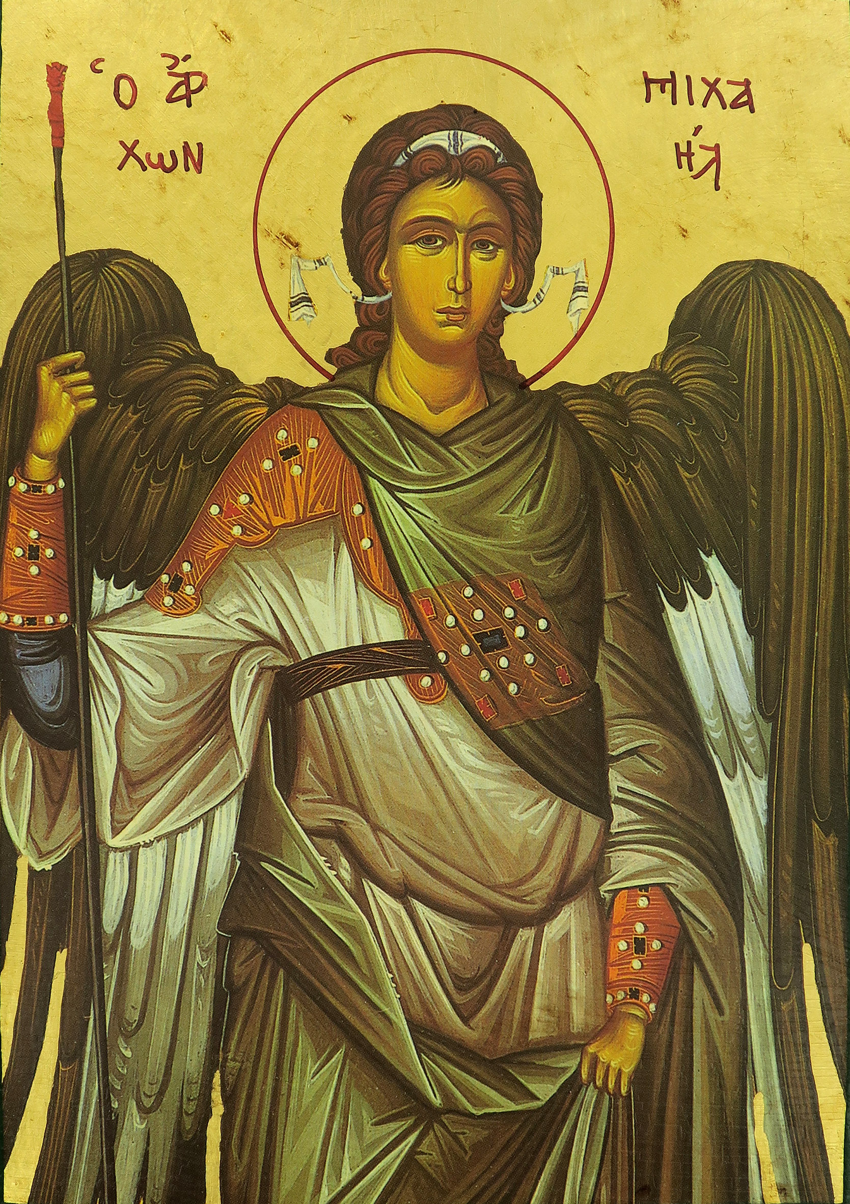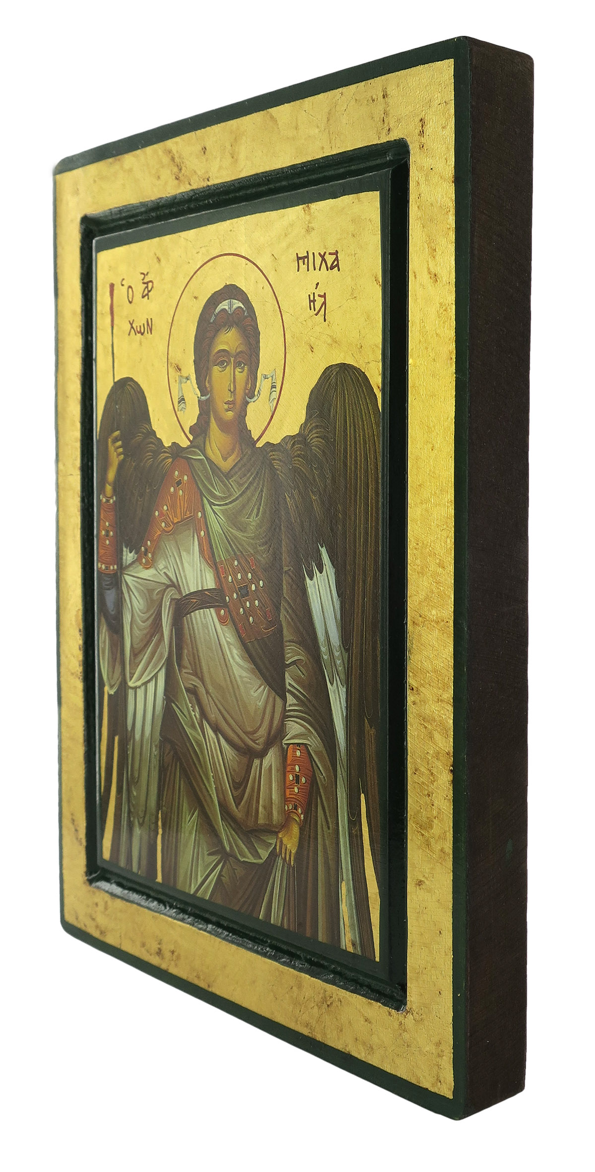 Icona da parete raffigurante San Michele Arcangelo, Principe delle milizie celesti. La sua funzione è quella di Comandante dell'esercito celeste contro gli angeli ribelli del diavolo. Definito "Tassiarca Arcangelo Michele" dalla fede ortodossa, l'arcangelo è una figura presente nelle dottrine del Cristianesimo, dell'Ebraismo e dell'Islam e indica una particolare tipologia di angelo (dal greco, "capo degli angeli").