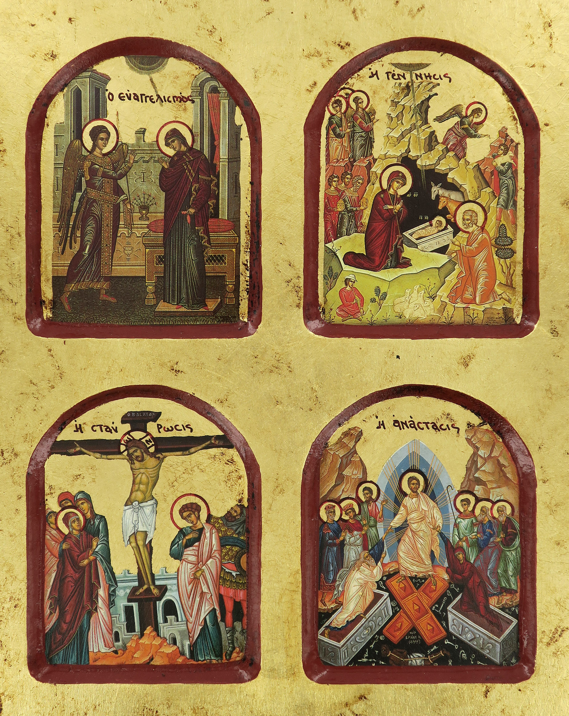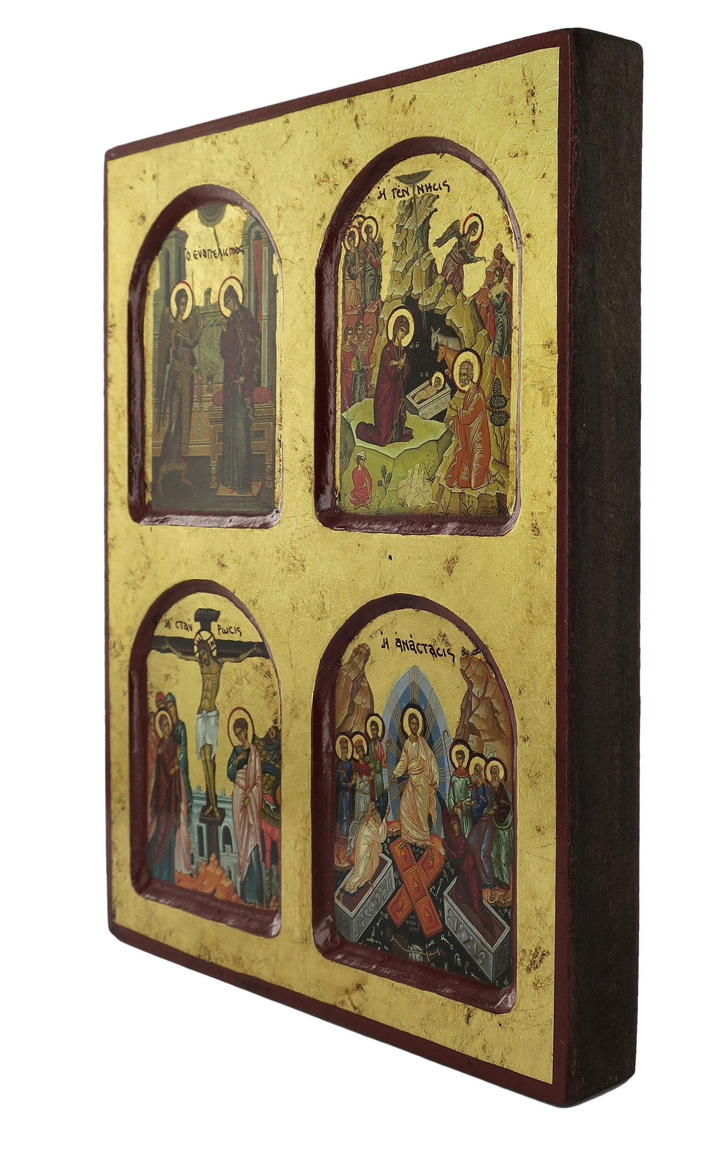 Questa icona da parete di legno presenta 4 immagini diverse che raffigurano episodi della vita di Gesù. Il quadretto-icona dell'altezza di 22 cm è realizzato con litografie incollate ad una tavola lignea, rifinite con scritte, aureole e bordi bordeaux tracciati a mano. Lo sfondo è abbellito da una rifinitura in foglia d'oro che renderà questa tavoletta ancora più bella e lucente. Un leggero effetto dona un aspetto anticato al manufatto.