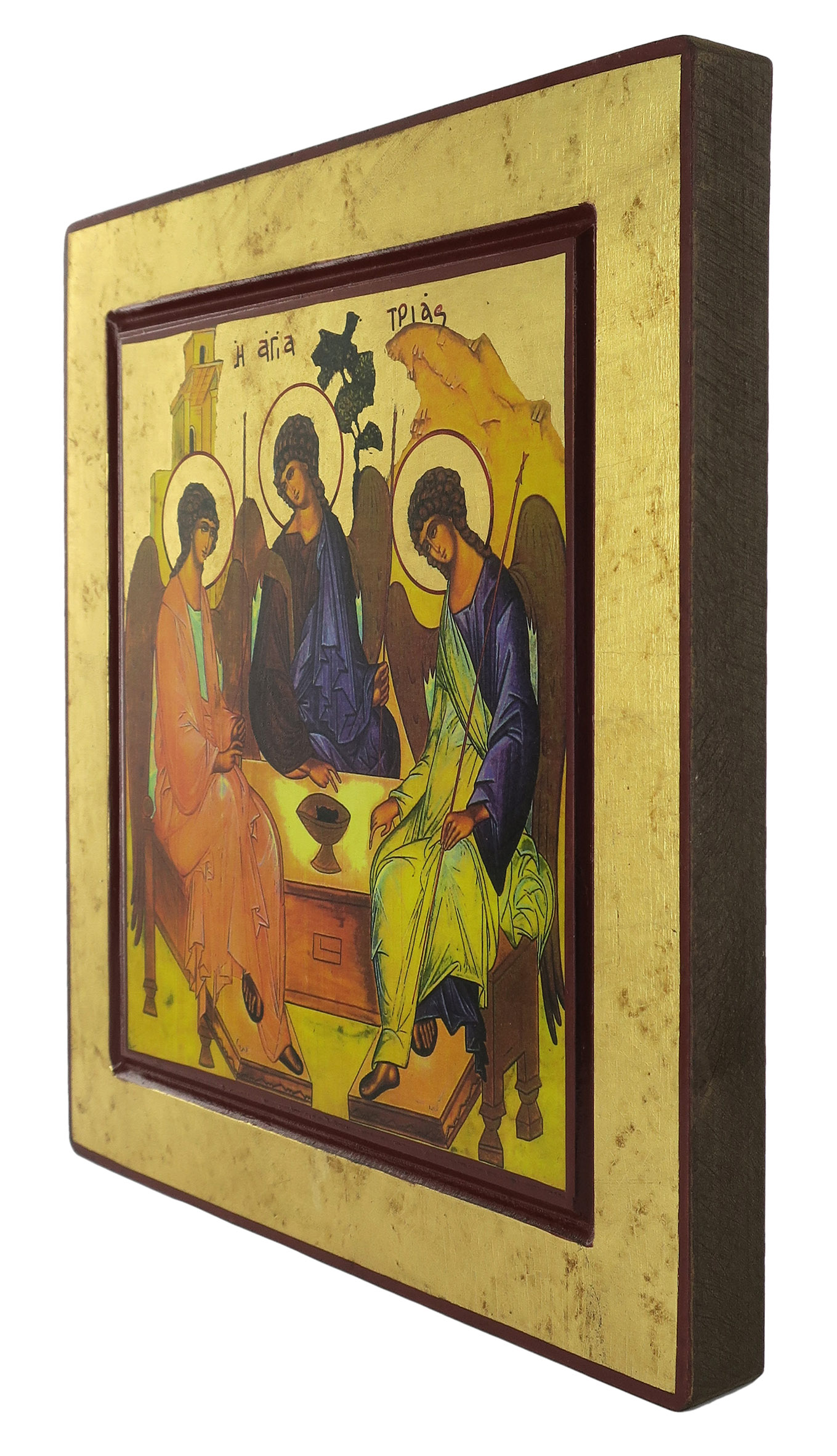 Icona Trinità di Rublev, Icona in Stile Arte Bizantina, Icona su Legno Rifinita con Aureole, Scritte e Bordure Fatte a Mano, Produzione Greca - 27 x 25 Cm