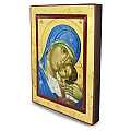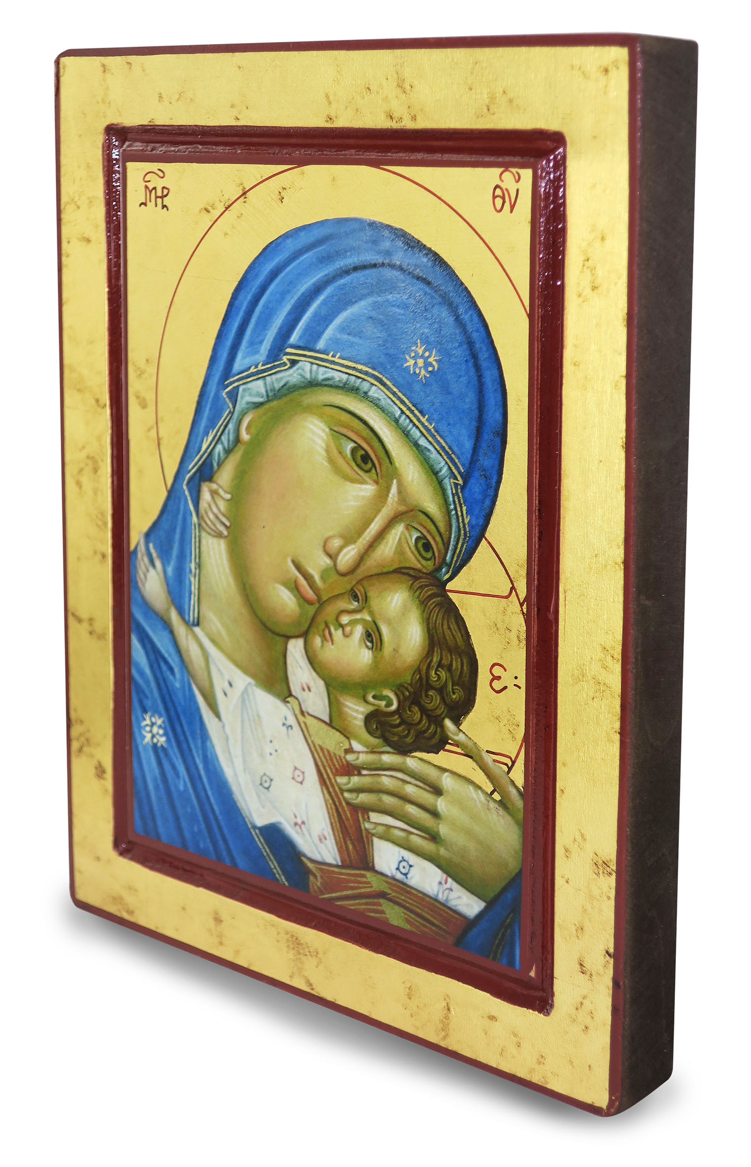 Icona da parete, di forma rettangolare, che raffigura il dettaglio del Volto della Vergine della Tenerezza. L'immagine è una fine litografia di una Madonna con Bambino, incollata su legno e rifinita con foglia d'oro, mentre le aureole, le scritte e i bordi sono realizzati a mano. Il contorno interno, incassato, divide la rappresentazione centrale dal bordo esterno, facendo sembrare quest'ultimo una cornice. Il gancio sul retro consente di appendere l'icona al muro.