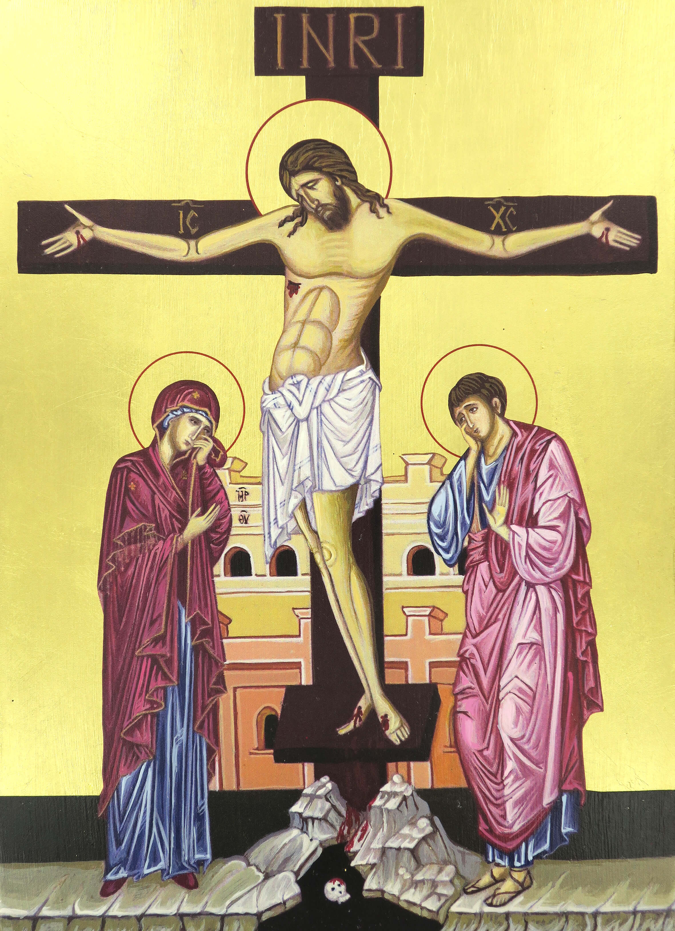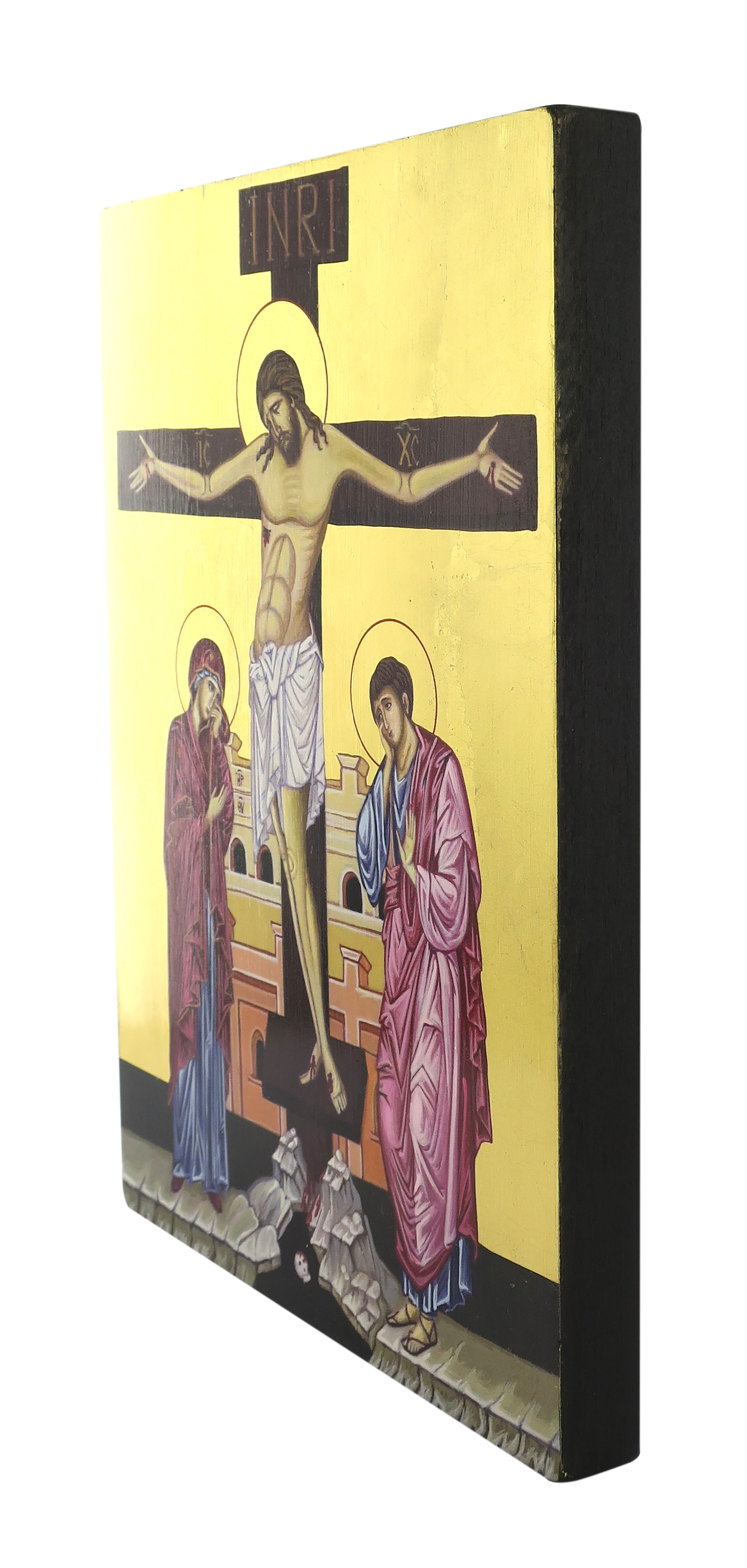 Icona raffigurante la Crocefissione di Gesù dipinta a mano secondo le tecniche bizantine. Le piccole imperfezioni che è possibile trovare sul manufatto sono la prova del lavoro svolto artigianalmente. Ai lati della croce, che domina l'immagine, sono raffigurati Maria e l'apostolo Giovanni al quale Gesù dalla croce offrì sua Madre per  tutti noi dicendo: "Madre ecco tuo figlio, figlio ecco tua Madre" e da quel momento Giovanni la prese con se. Il corpo di Cristo, anche se in apparenza morto, in realtà emana una luce particolare che preannuncia cosi la Resurezzione.