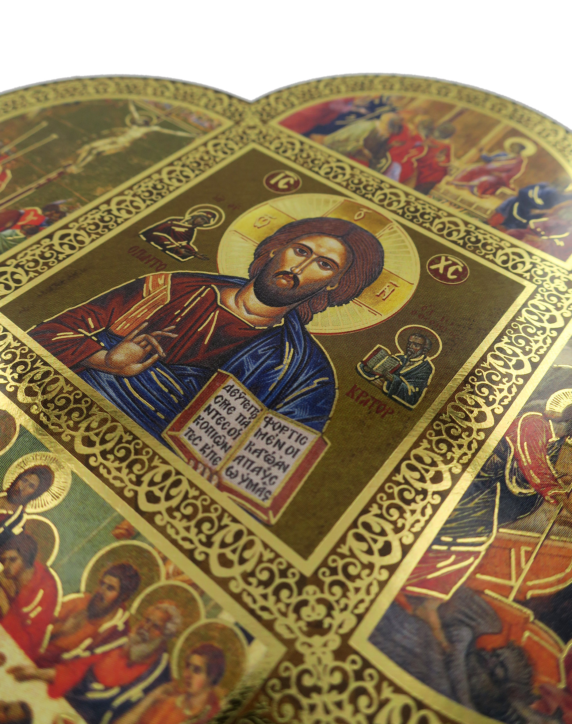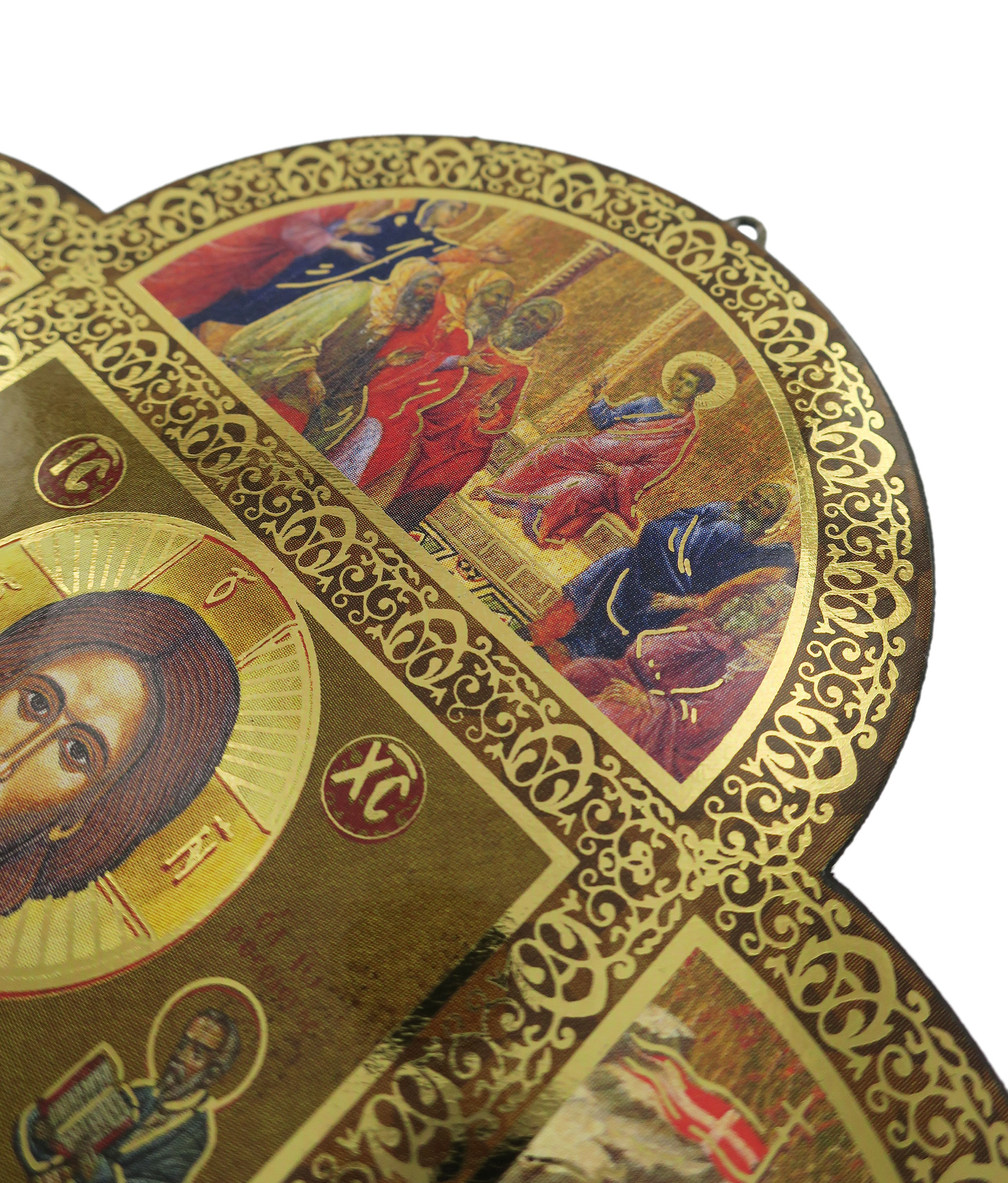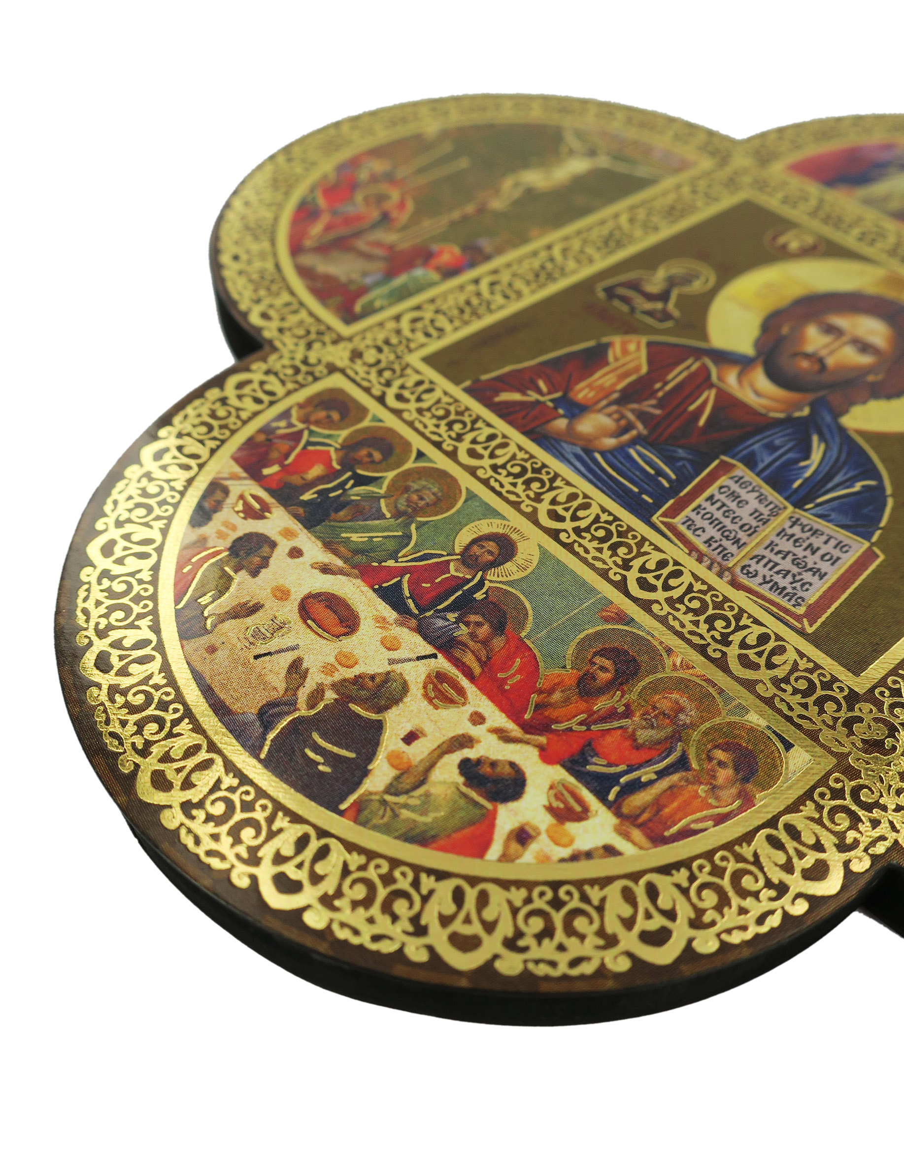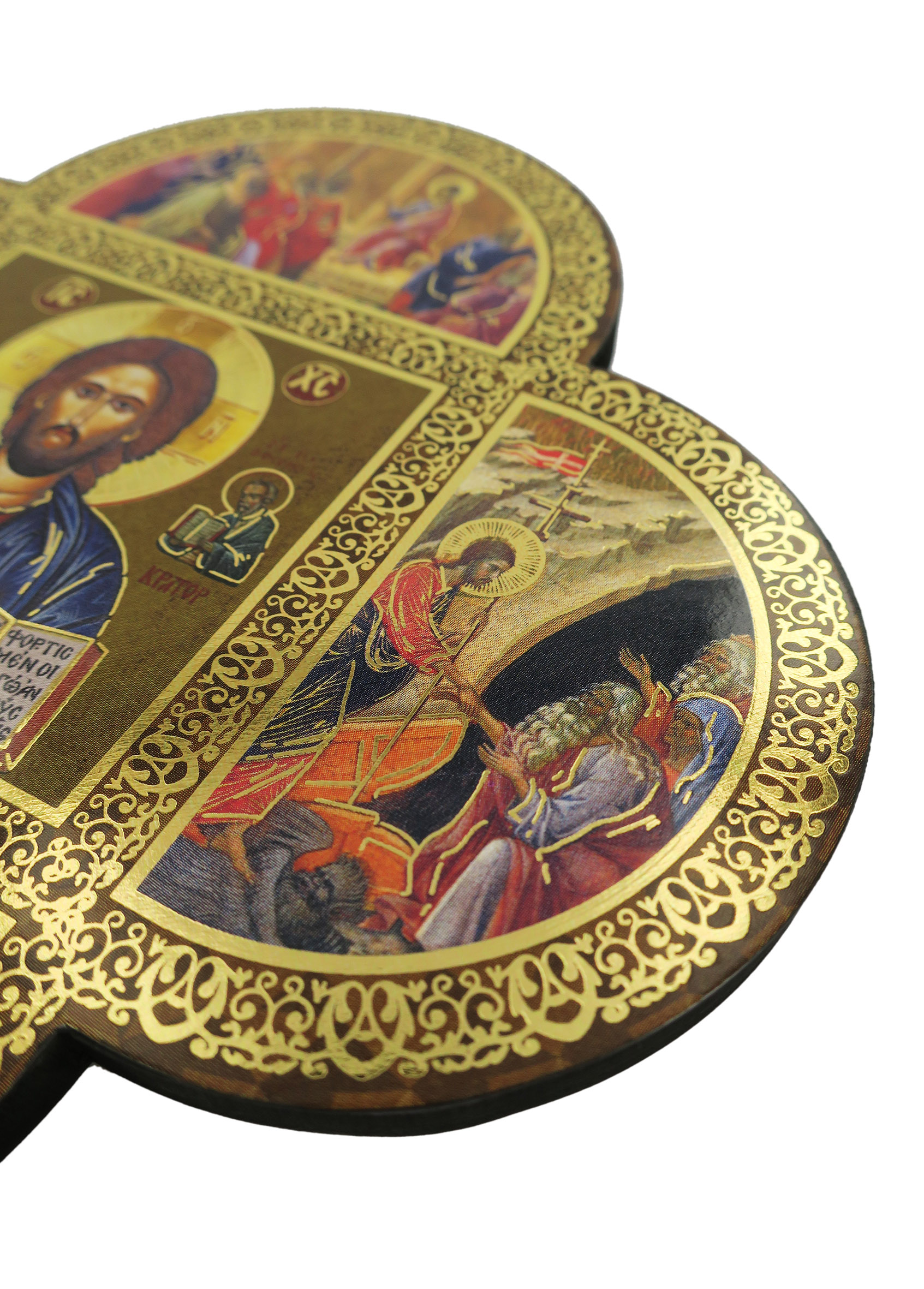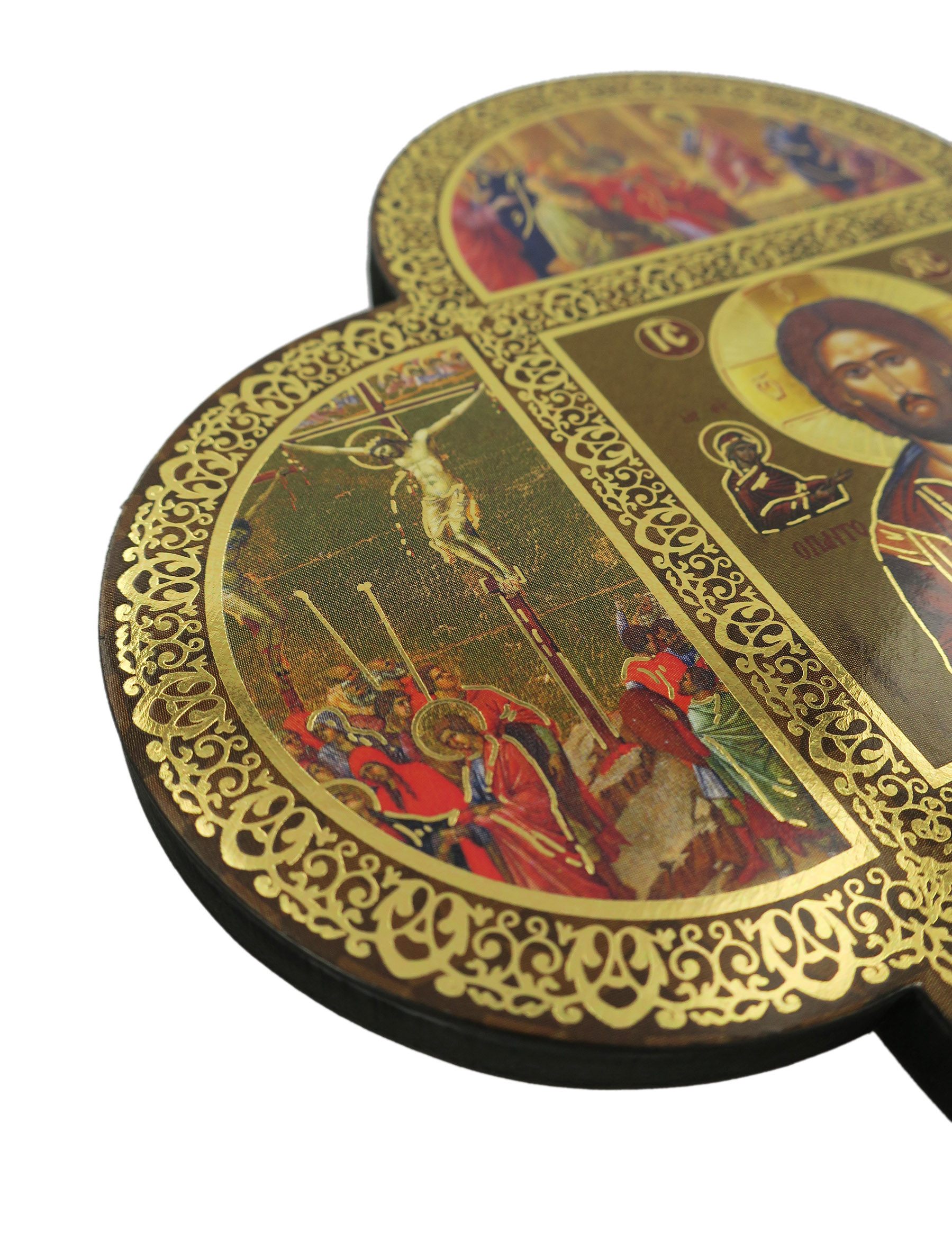 Croce in legno MDF con le 4 estremità arrotondate a semicerchio volte a delineare la forma caratteristica della Cristianità. La tavoletta a forma di croce è suddivisa in settori contornati da un intreccio decorativo color oro raffiguranti scene relative alla vita di Cristo. Le rappresentazioni sono stampe a colori (tra cui il color oro) su carta, poi applicate alla croce-icona in MDF. La parte quadrata centrale, più grande, mostra la figura del Signore con un'aureola color oro intorno al volto, un libro e la mano benedicente.