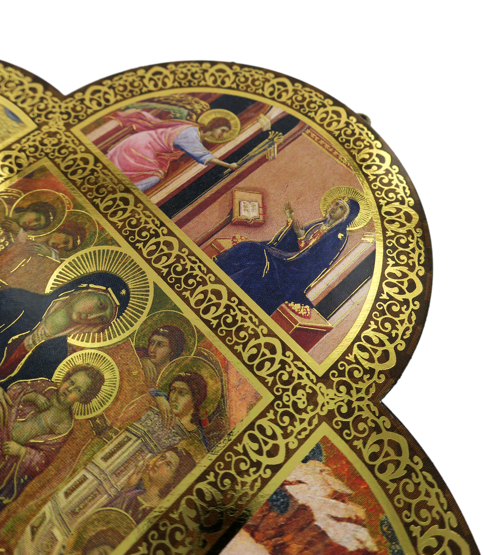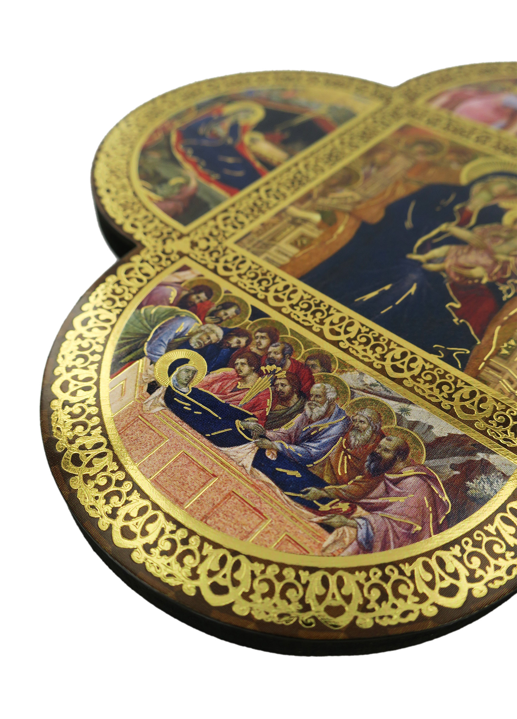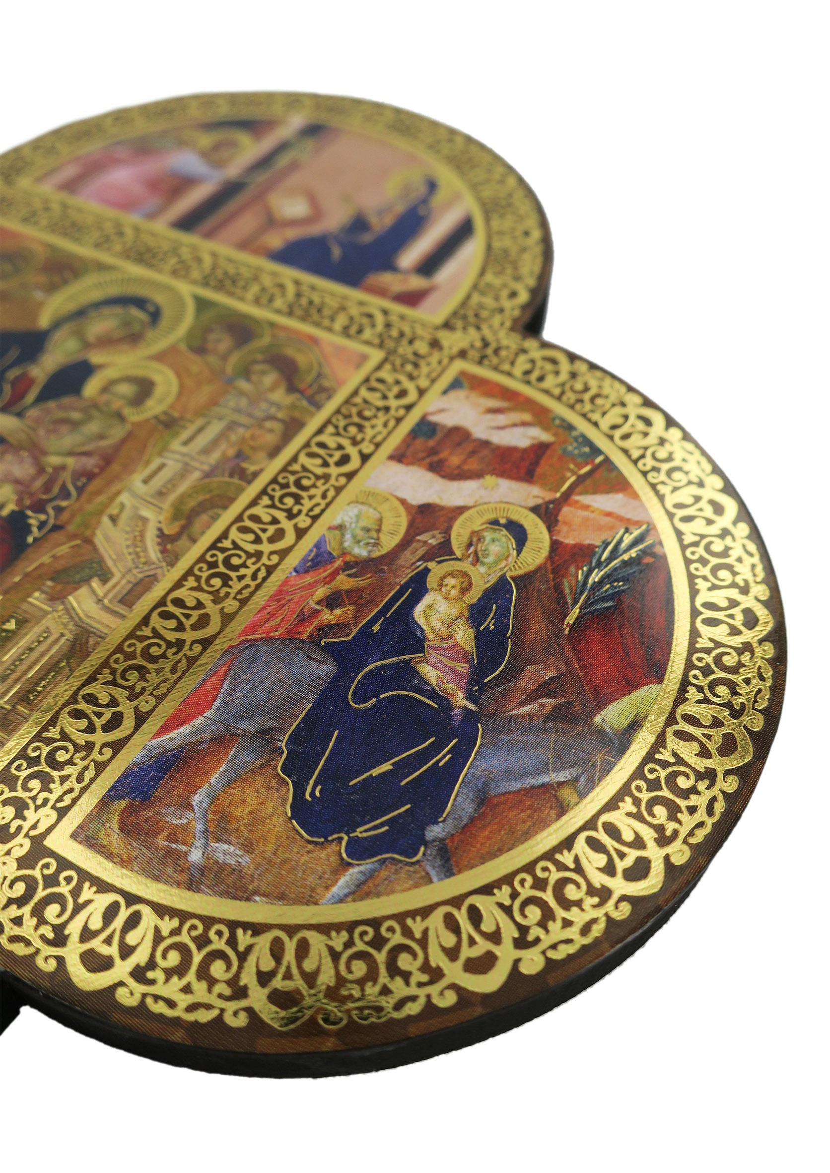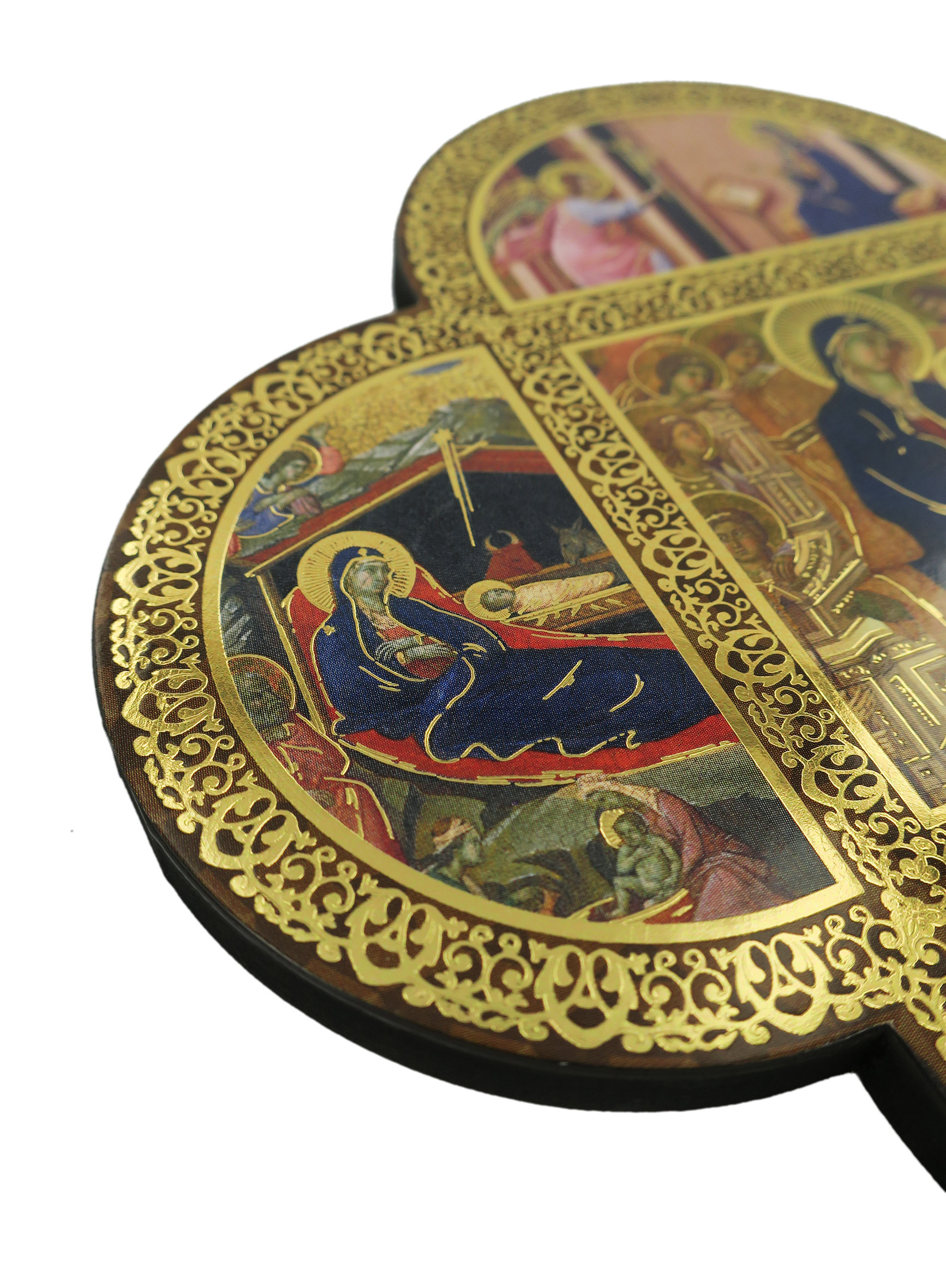 Croce in legno MDF con le 4 estremità arrotondate a semicerchio volte a delineare la forma caratteristica della Cristianità. La tavoletta a forma di croce è suddivisa in settori contornati da un intreccio decorativo color oro raffiguranti scene relative alla vita di Maria. Le rappresentazioni sono stampe su carta poi applicate alla croce-icona.