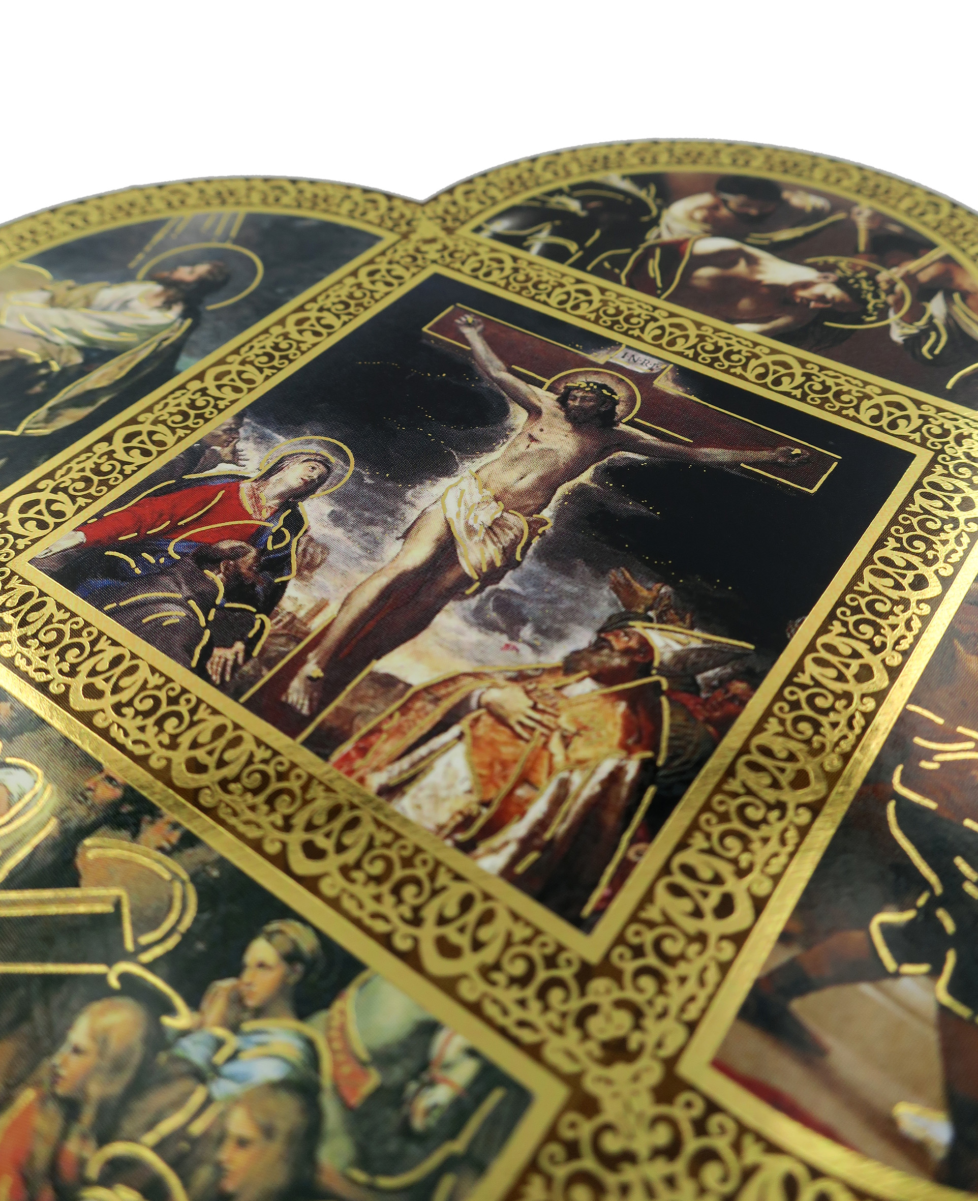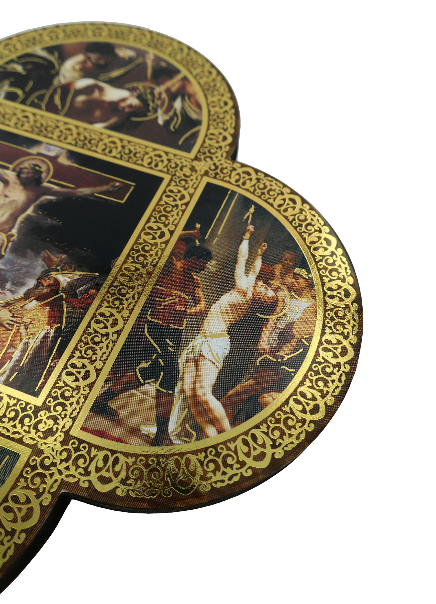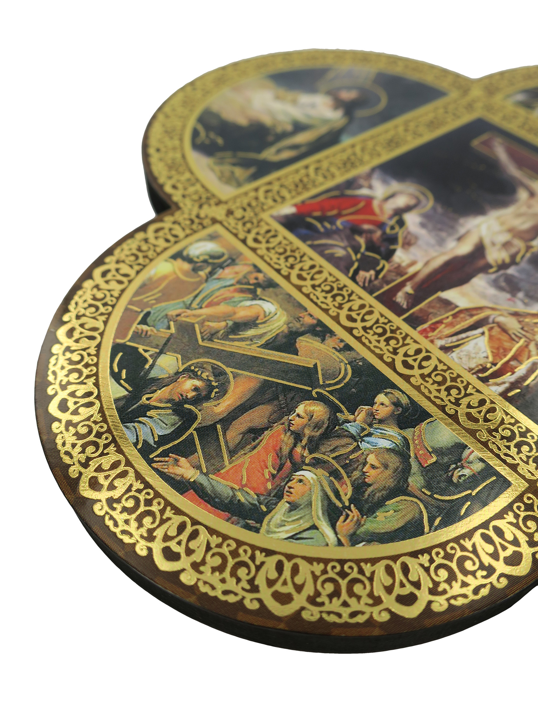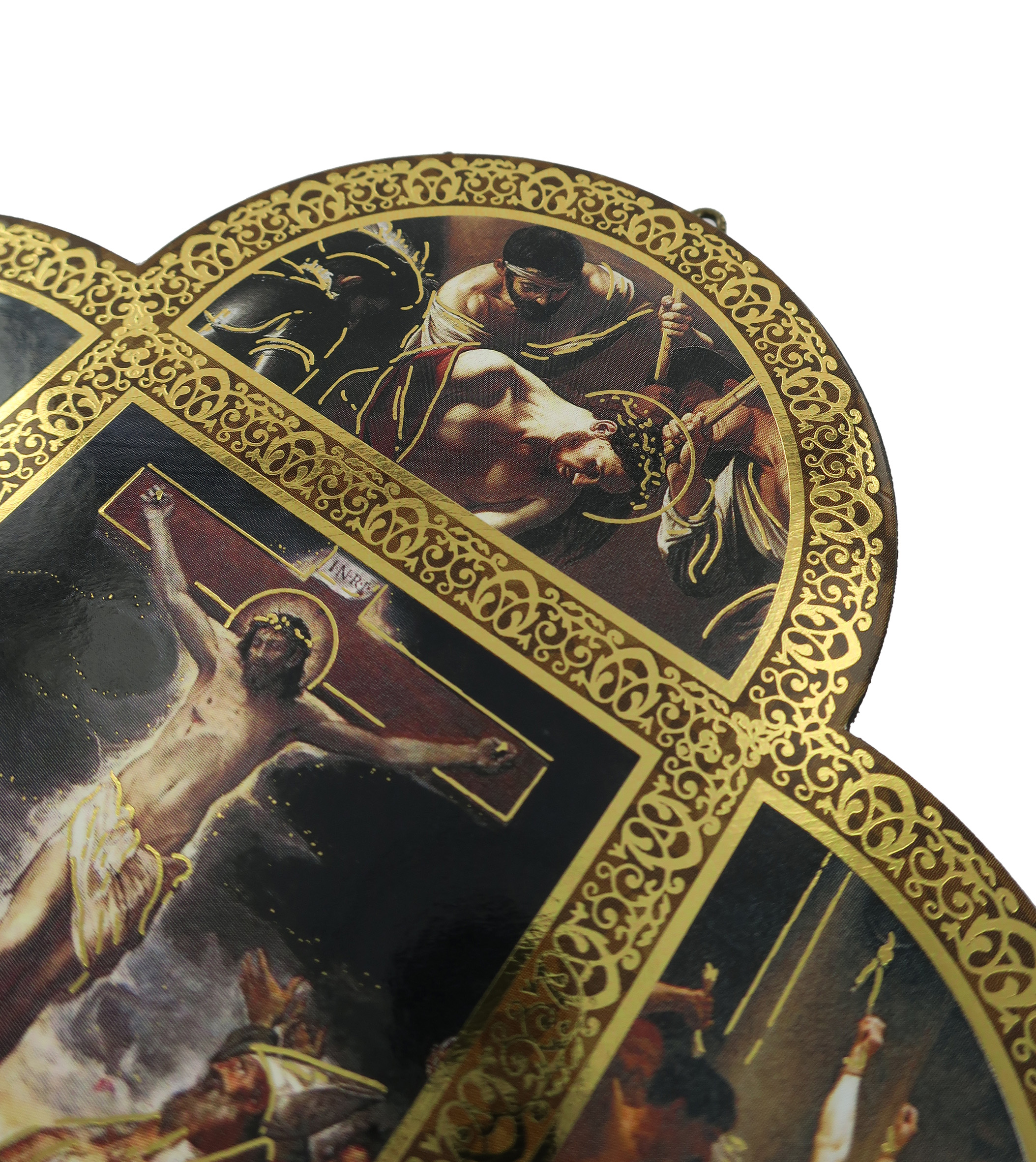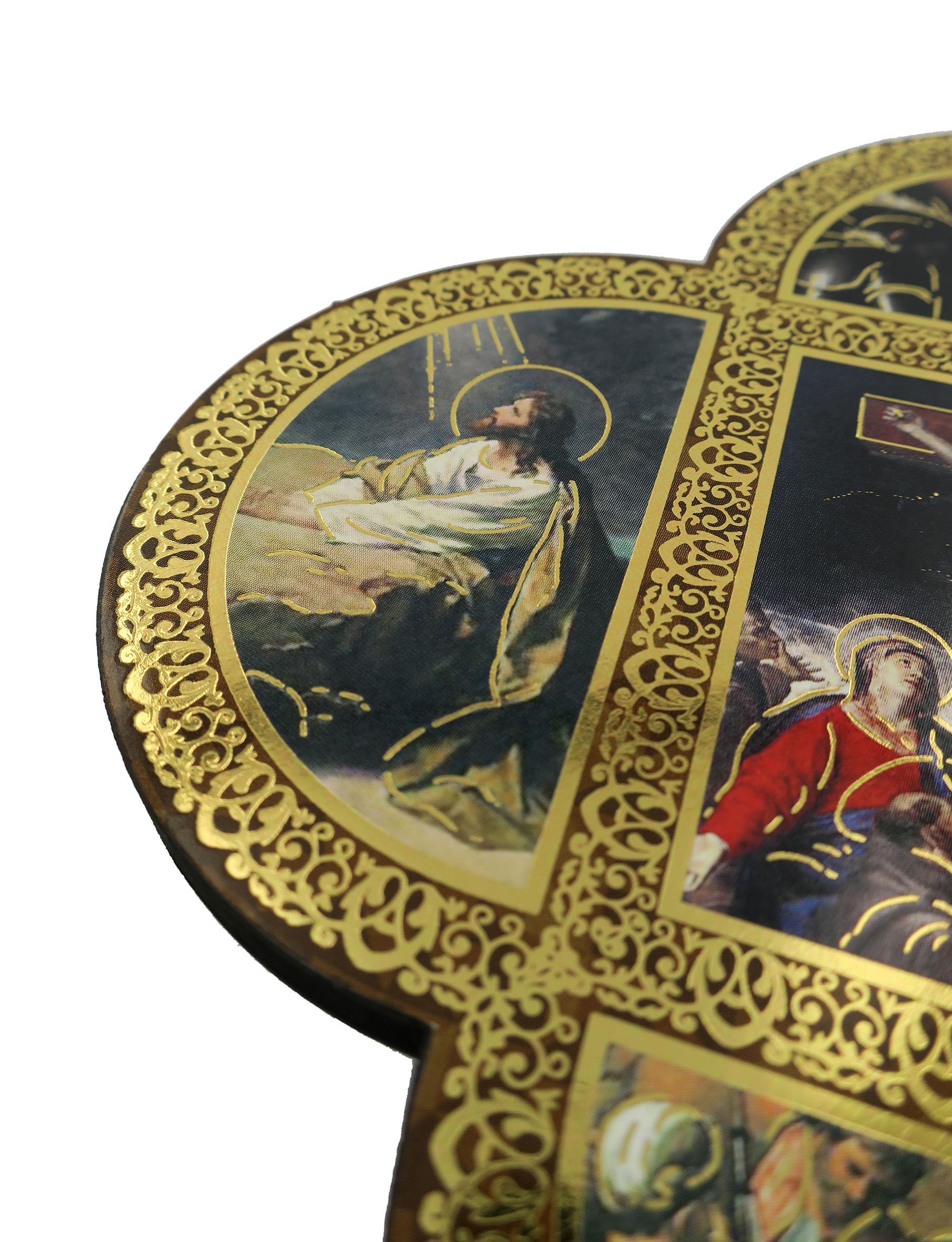 Croce in legno MDF con le 4 estremità arrotondate a semicerchio volte a delineare la forma caratteristica della Cristianità. La tavoletta a forma di croce è suddivisa in settori contornati da un intreccio decorativo color oro in cui sono raffigurate scene relative ai Misteri del Dolore. Le rappresentazioni sono stampe a colori (tra cui il color oro) su carta, poi applicate alla croce-icona in MDF.