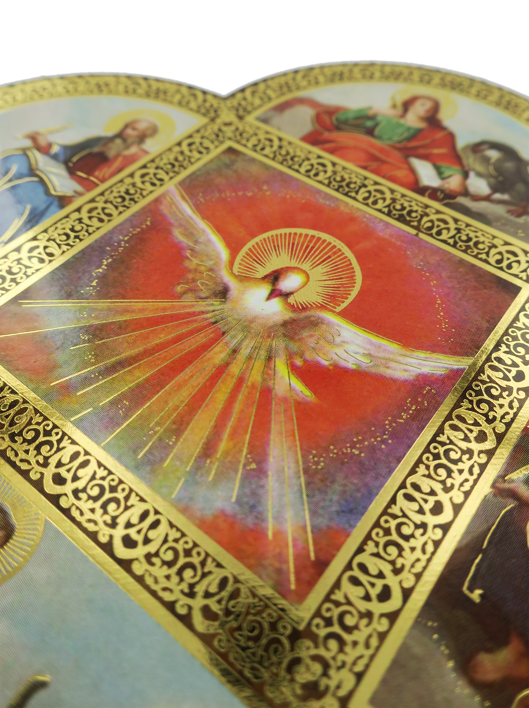 La parte quadrata centrale, più grande, mostra una colomba con aureola, con raggi che si propagano sullo sfondo di un forte rosso. A contorno, sono rappresentati i quattro Evangelisti con le loro simbologie: Marco con il leone, Luca con il bue, Giovanni con l'aquila e Matteo con l'uomo alato (o angelo). Ad attirare l'attenzione dello spettatore è il contrasto cromatico tra il quadro centrale e i delicati colori delle 4 rappresentazioni a semicerchio.