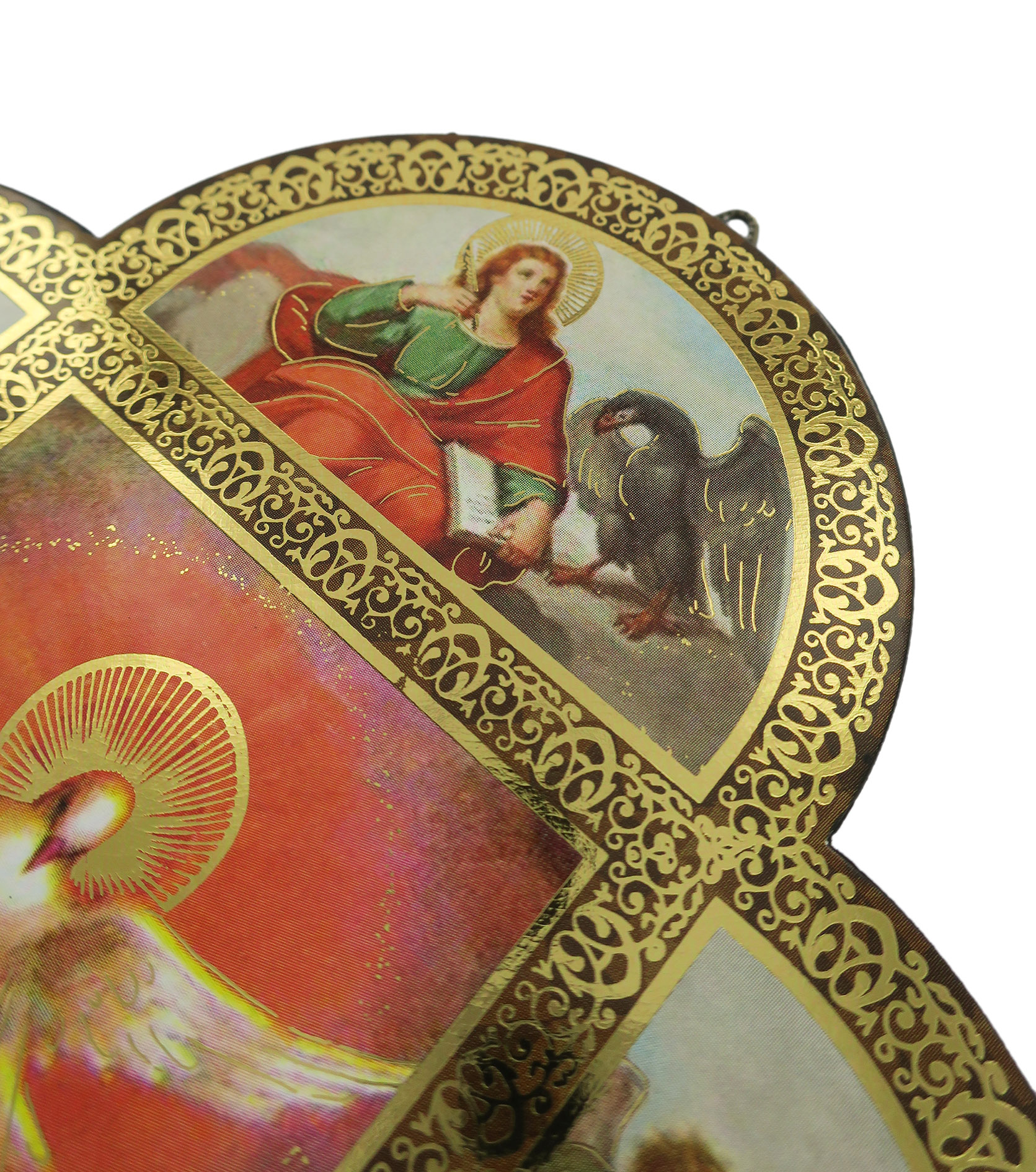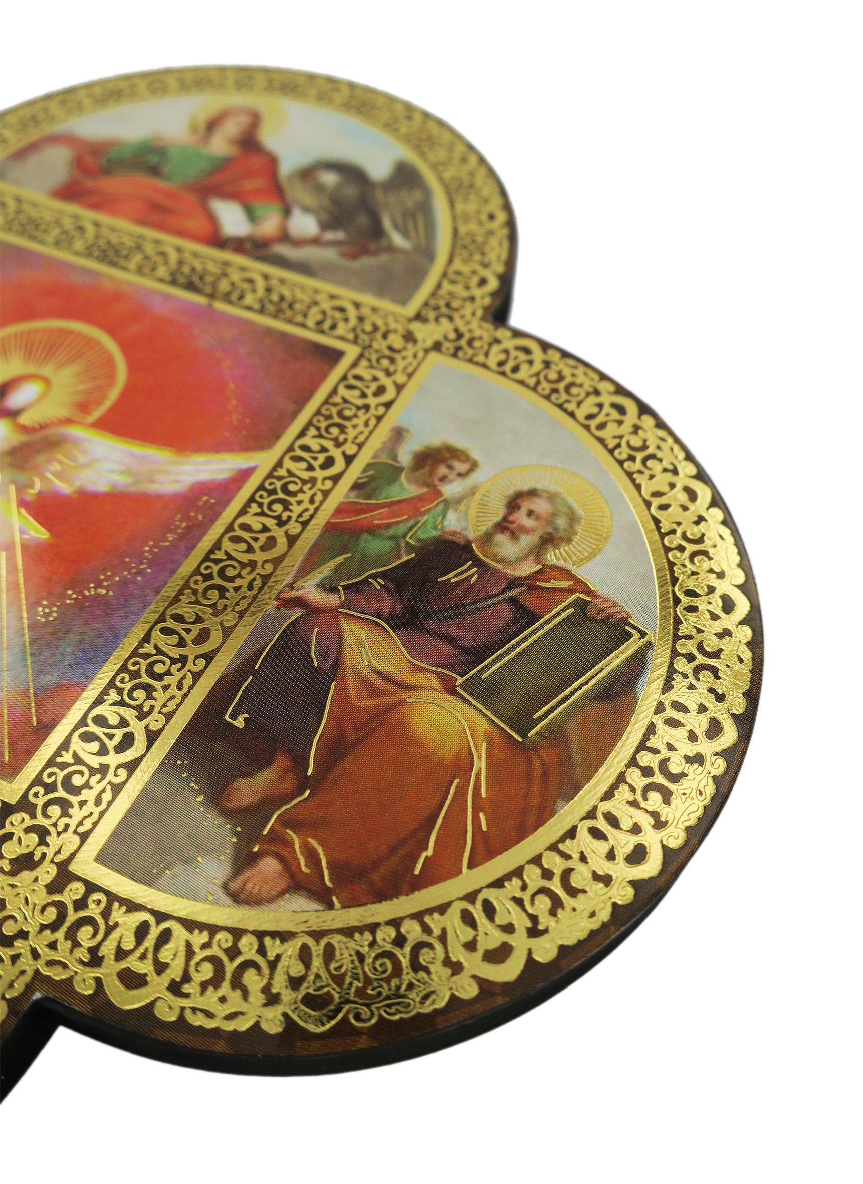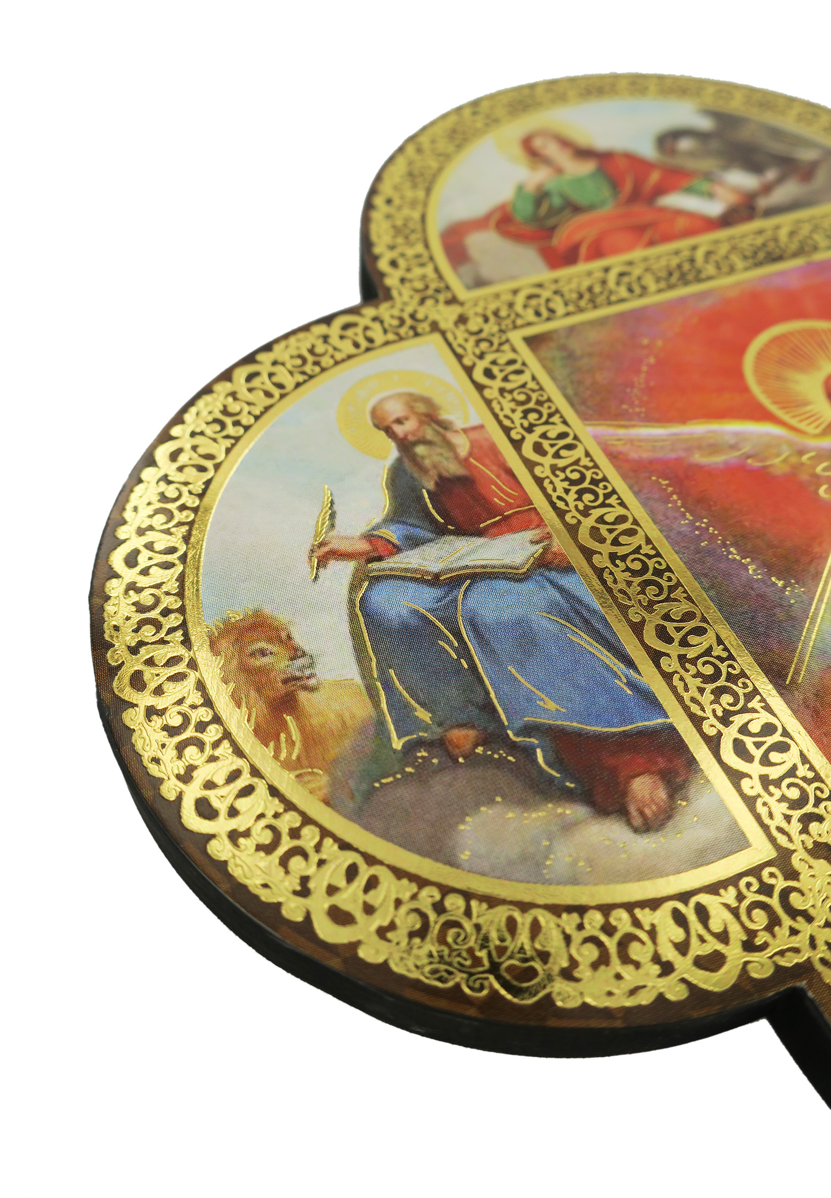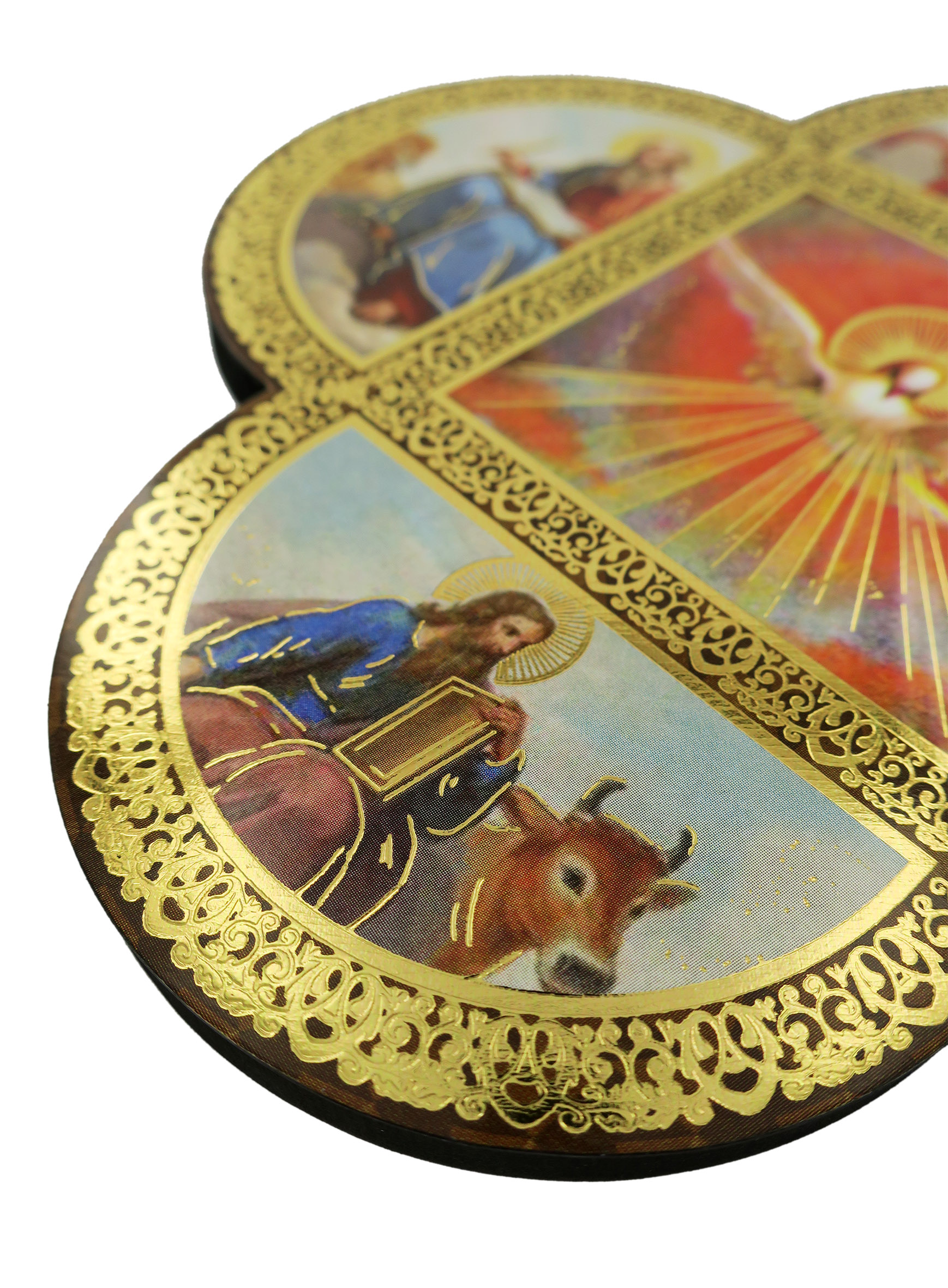 Croce in legno MDF con le 4 estremità arrotondate a semicerchio volte a delineare la forma caratteristica della Cristianità. La tavoletta a forma di croce è suddivisa in settori contornati da un intreccio decorativo color oro in cui sono raffigurati i quattro Evangelisti intendi a narrare la vita del Signore. Le rappresentazioni sono stampe a colori (tra cui il color oro) su carta, poi applicate alla croce-icona in MDF.