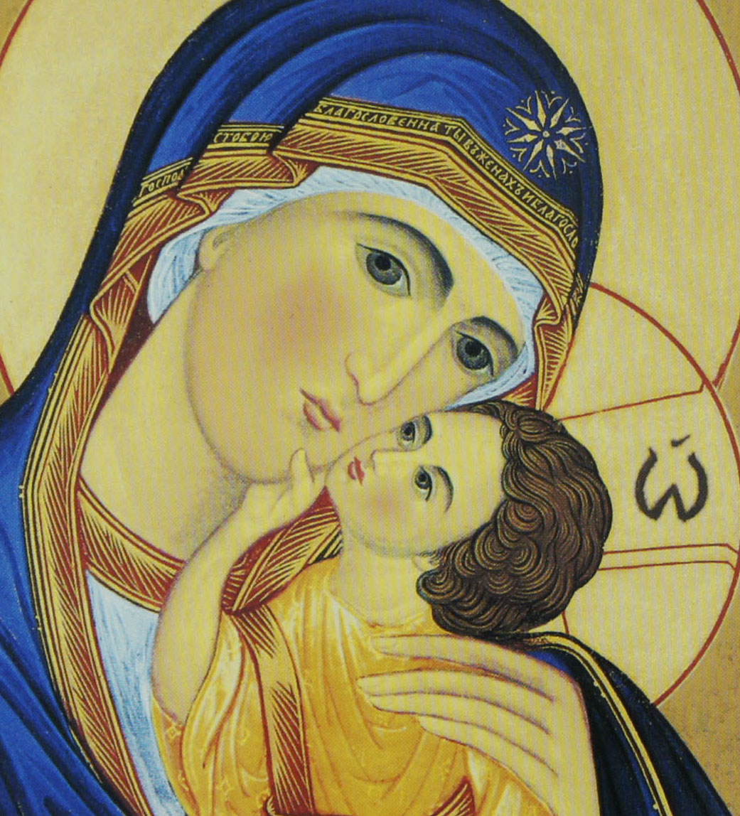 Tavola icona raffigurante la Madonna col Bambino in braccio. Questa immagine è una stampa su tavolo in legno con particolari dorati e blu.