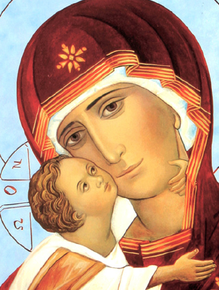 Tavola icona raffigurante la Madonna col Bambino in braccio. Questa immagine è una stampa su tavolo in legno con particolari dorati.