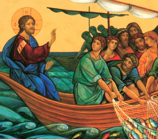 Icona raffigurante la Pesca Miracolosa. Questa immagine è una stampa su tavola in legno.