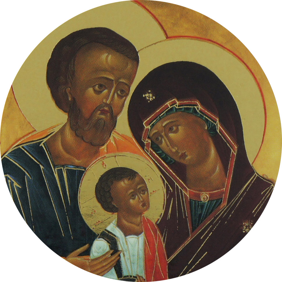 Tavola icona raffigurante la Sacra Famiglia. Questa immagine è una stampa su tavolo in legno a forma di cuspide.