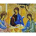 La tavola raffigura "la Trinità" o "Ospitalità di Abramo", opera di Andrej Rublev, considerato il più grande pittore di icone. Il dipinto raffigura la scena della visita fatta dalla trinità ad Abramo per promettere a lui e alla moglie Sara una discendenza. Secondo la tradizione il soggetto raffigurato sulla sinistra è Dio Padre, al centro è collocato Gesù e sulla destra è presente lo Spirito Santo. Al centro del dipinto è raffigurato un calice simbolo del sacrificio eucaristico del Cristo.