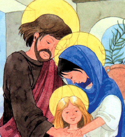 Tavola in legno raffigurante la Sacra Famiglia in stile infantile. L'immagine è una stampa su legno.