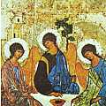 Stampa su legno raffigurante "la Trinità" del pittore Andrej Rublev. Dimensioni: 10,5 x 6 cm.