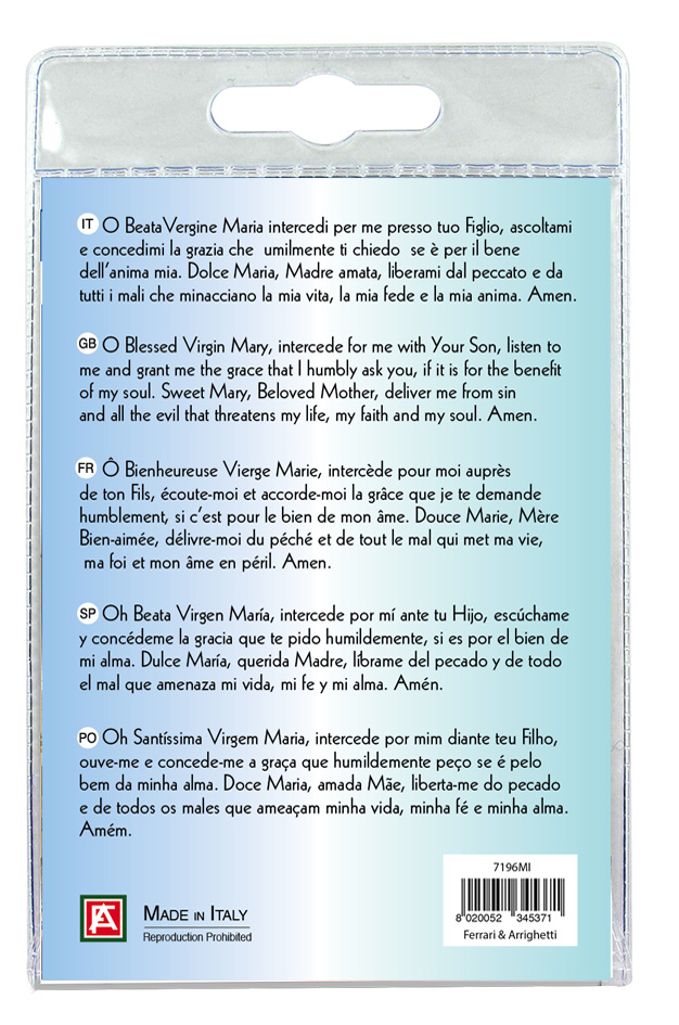 Il blister si presenta con un cartoncino rappresentante la Madonna Miracolosa, sul retro di esso vi è stampata una preghiera in cinque lingue dedicata alla Vergine.
