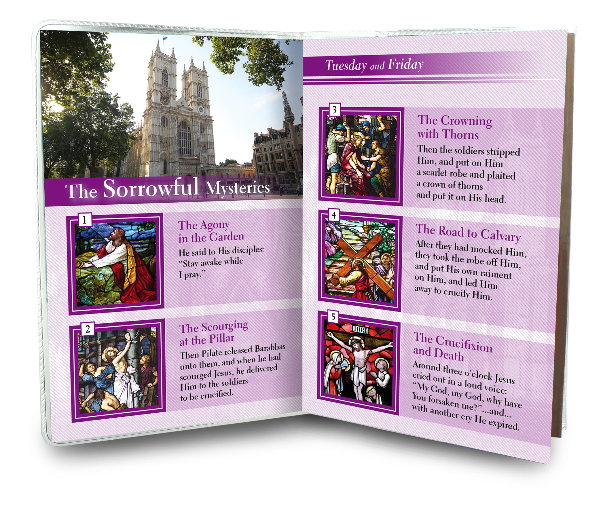 Il libretto, composto da 16 pagine, si presenta con una copertina in plastica trasparente e nell'interno vi è un piccolo rosario con i grani tipo perlina del diamero di mm 4.