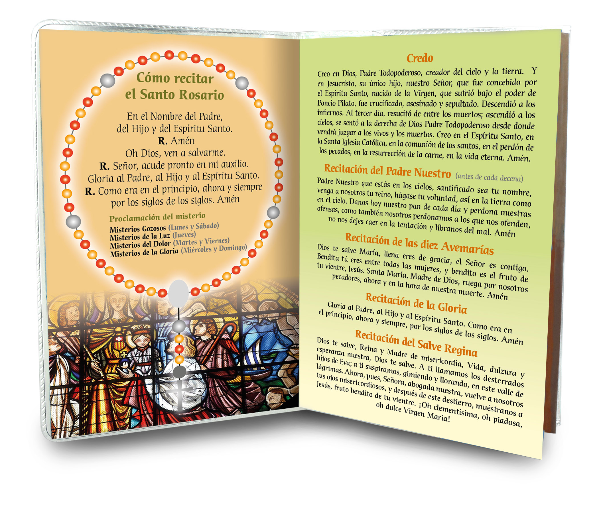 Il libretto, composto da 16 pagine, si presenta con una copertina in plastica trasparente e nell'interno vi è un piccolo rosario con i grani tipo perlina del diamero di mm 4.