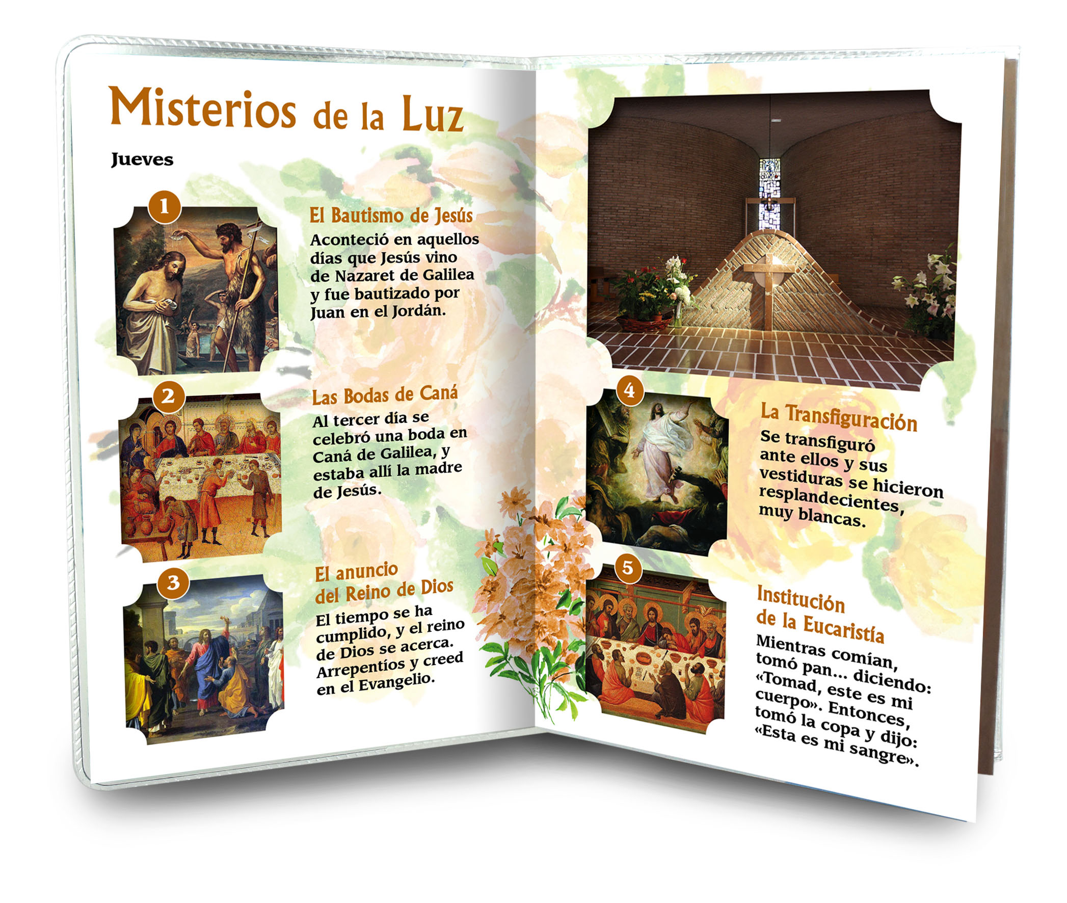 Il libretto, composto da 16 pagine, si presenta con una copertina in plastica trasparente e nell'interno vi è un piccolo rosario con i grani tipo perlina del diamero di mm 4.