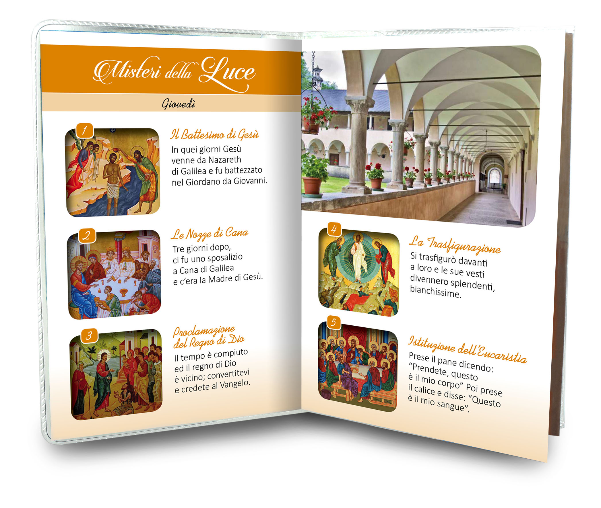 Il libretto, composto da 16 pagine, si presenta con una copertina in plastica trasparente e nell'interno vi è un piccolo rosario con i grani tipo perlina del diamero di mm 4.