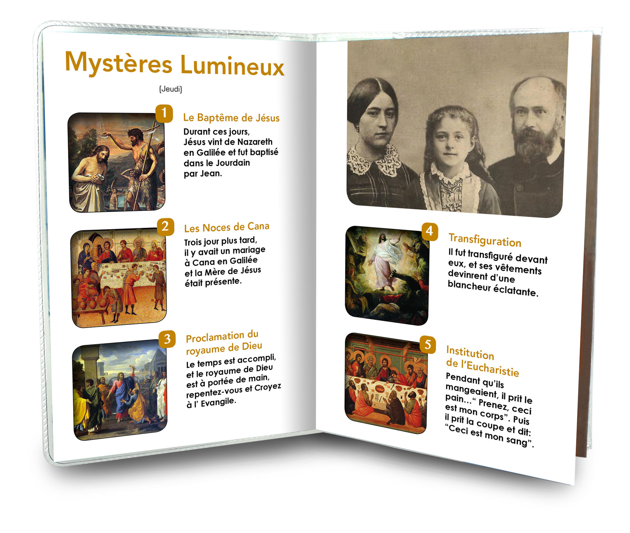 Il libretto, composto da 16 pagine, si presenta con una copertina in plastica trasparente e nell'interno vi è un piccolo rosario con i grani tipo perlina del diamero di mm 4.