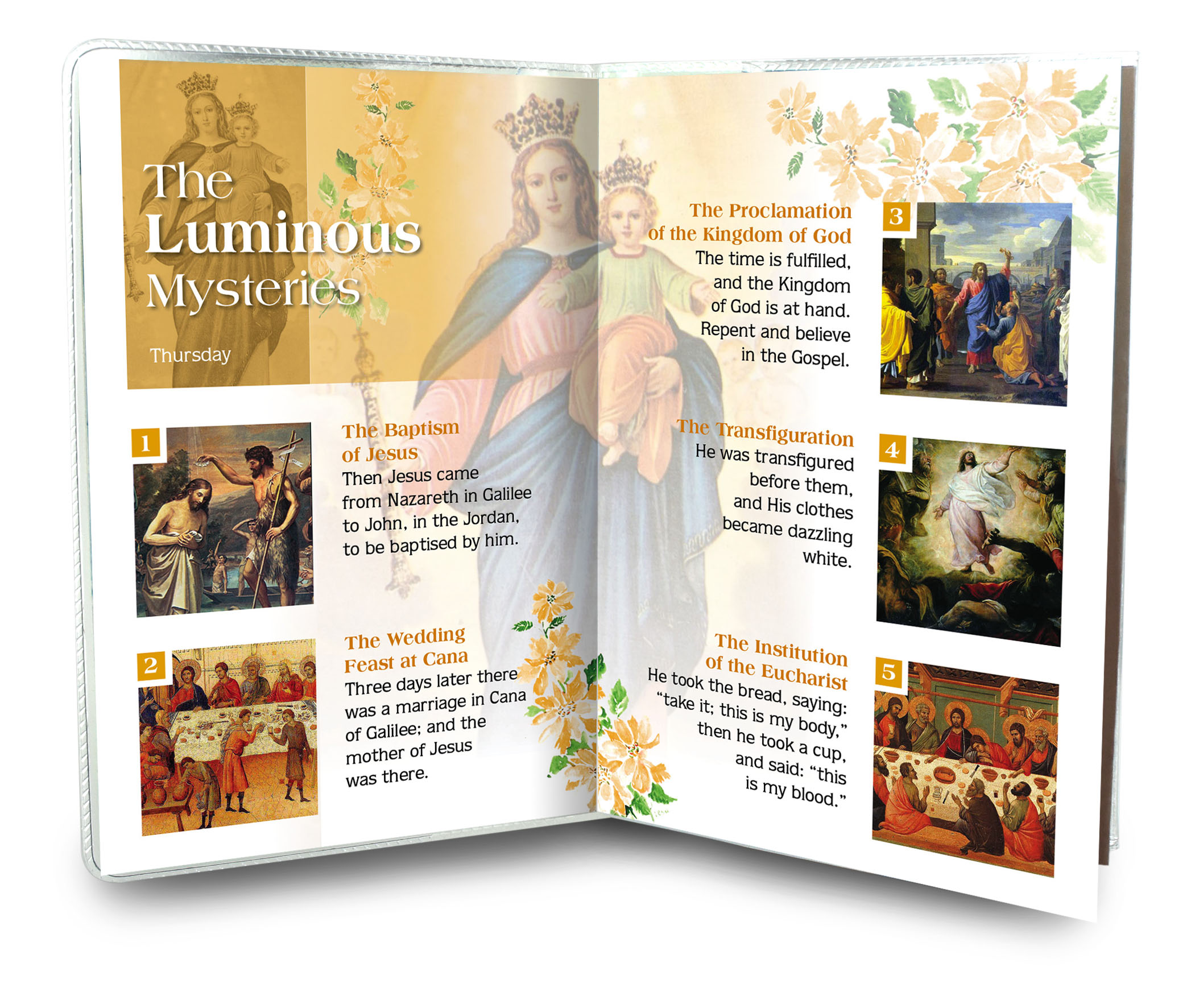 Il libretto, composto da 16 pagine, si presenta con una copertina in plastica trasparente e nell'interno vi è un piccolo rosario con i grani tipo perlina del diamero di mm 4.