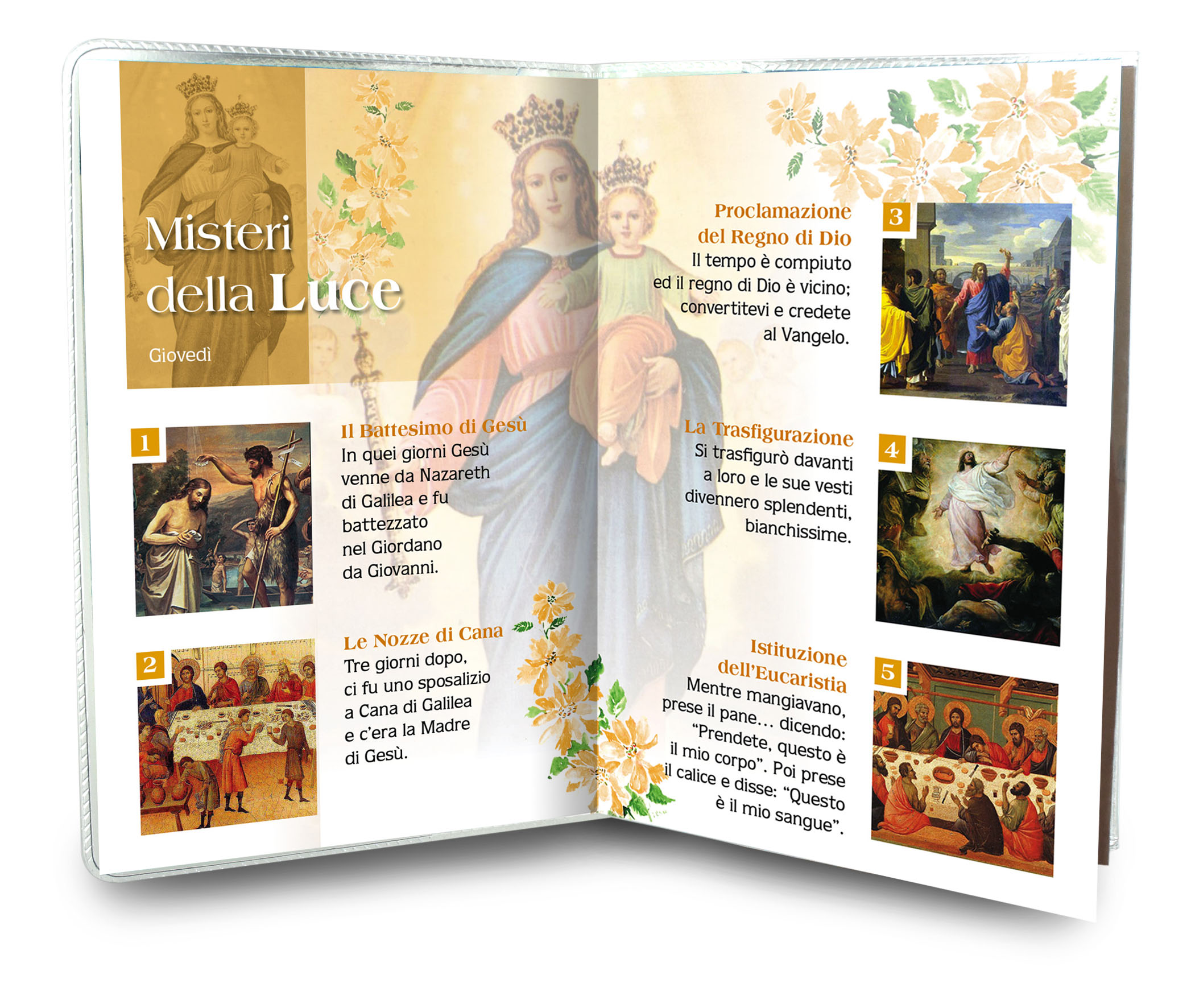 Il libretto, composto da 16 pagine, si presenta con una copertina in plastica trasparente e nell'interno vi è un piccolo rosario con i grani tipo perlina del diamero di mm 4.