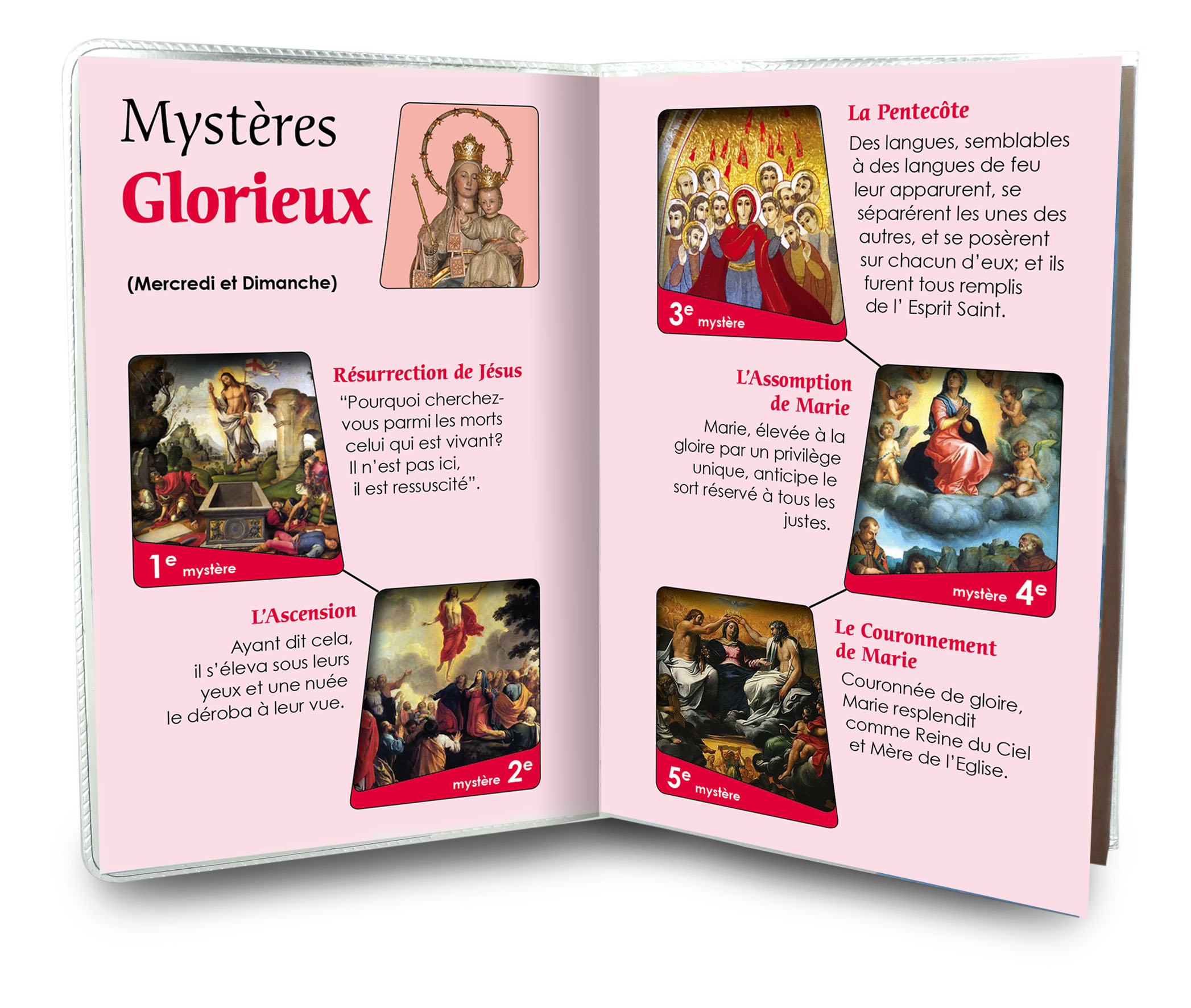 Il libretto, composto da 16 pagine, si presenta con una copertina in plastica trasparente e nell'interno vi è un piccolo rosario con i grani tipo perlina del diamero di mm 4.
