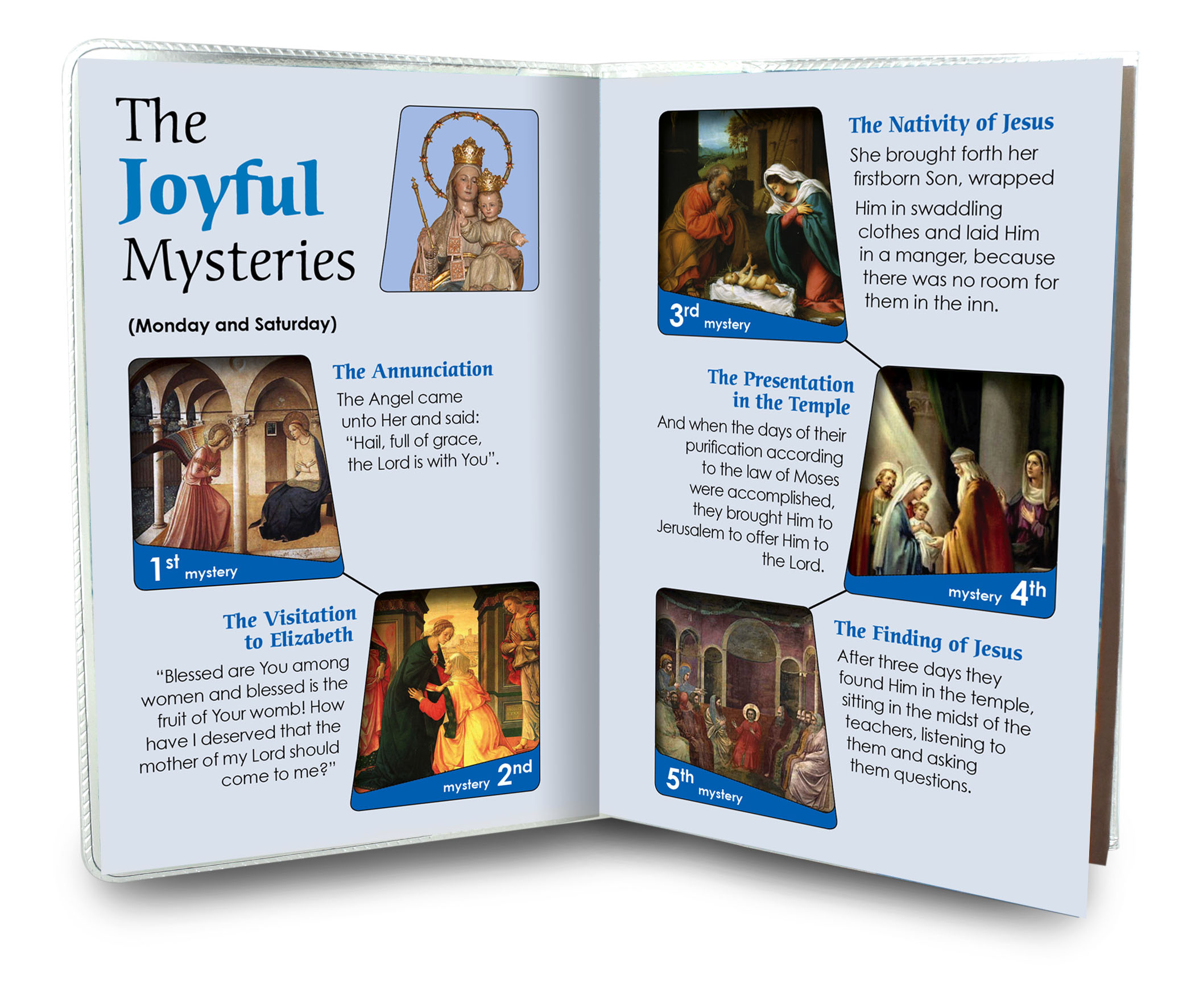 Il libretto, composto da 16 pagine, si presenta con una copertina in plastica trasparente e nell'interno vi è un piccolo rosario con i grani tipo perlina del diamero di mm 4.