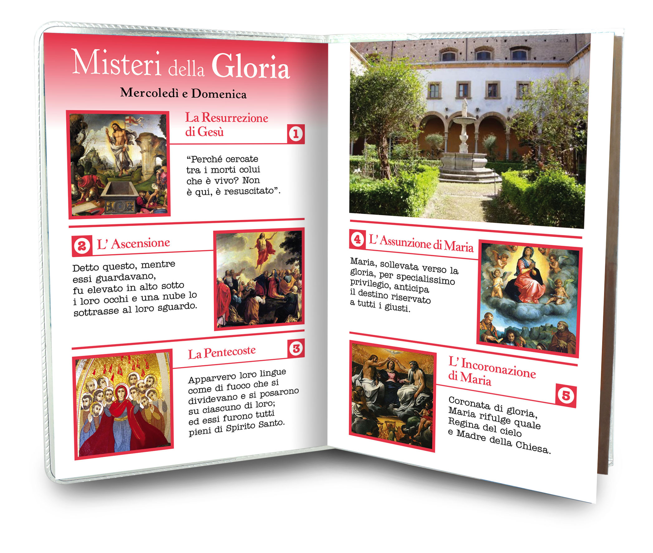 Il libretto, composto da 16 pagine, si presenta con una copertina in plastica trasparente e nell'interno vi è un piccolo rosario con i grani tipo perlina del diamero di mm 4.