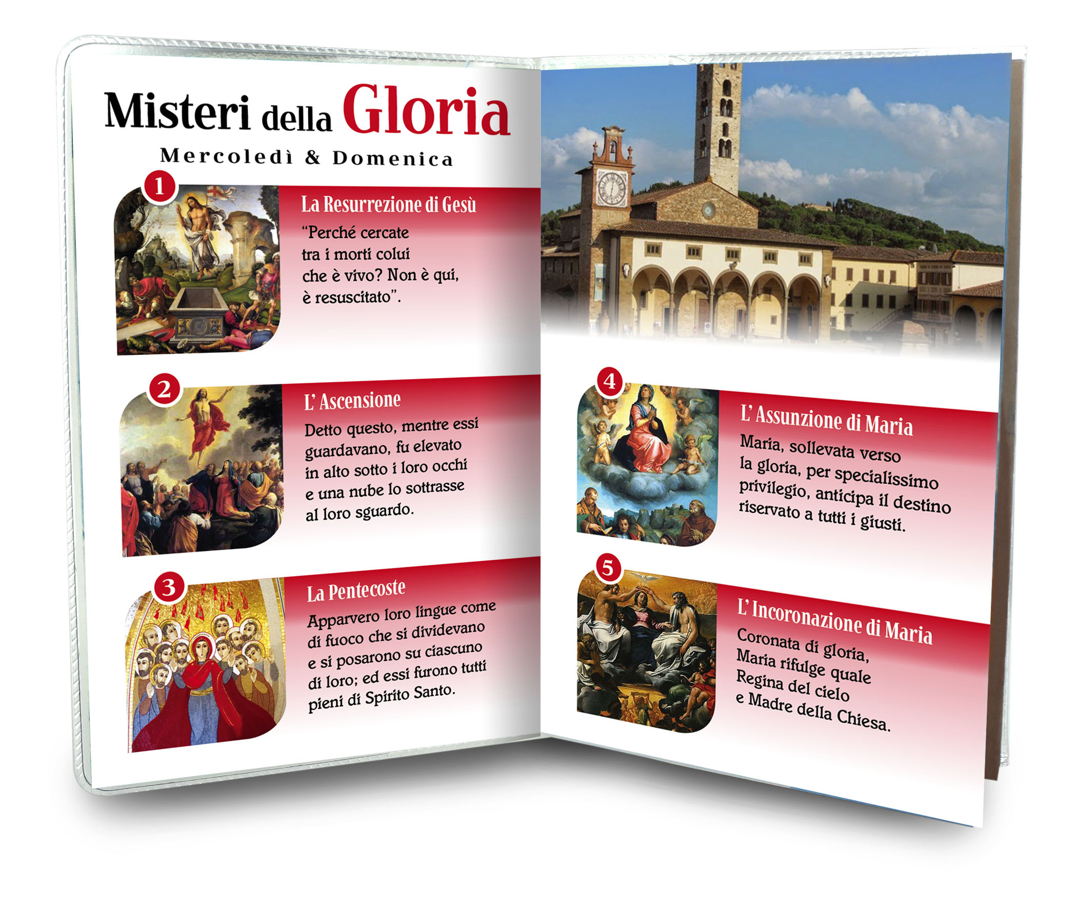 Il libretto, composto da 16 pagine, si presenta con una copertina in plastica trasparente e nell'interno vi è un piccolo rosario con i grani tipo perlina del diamero di mm 4.