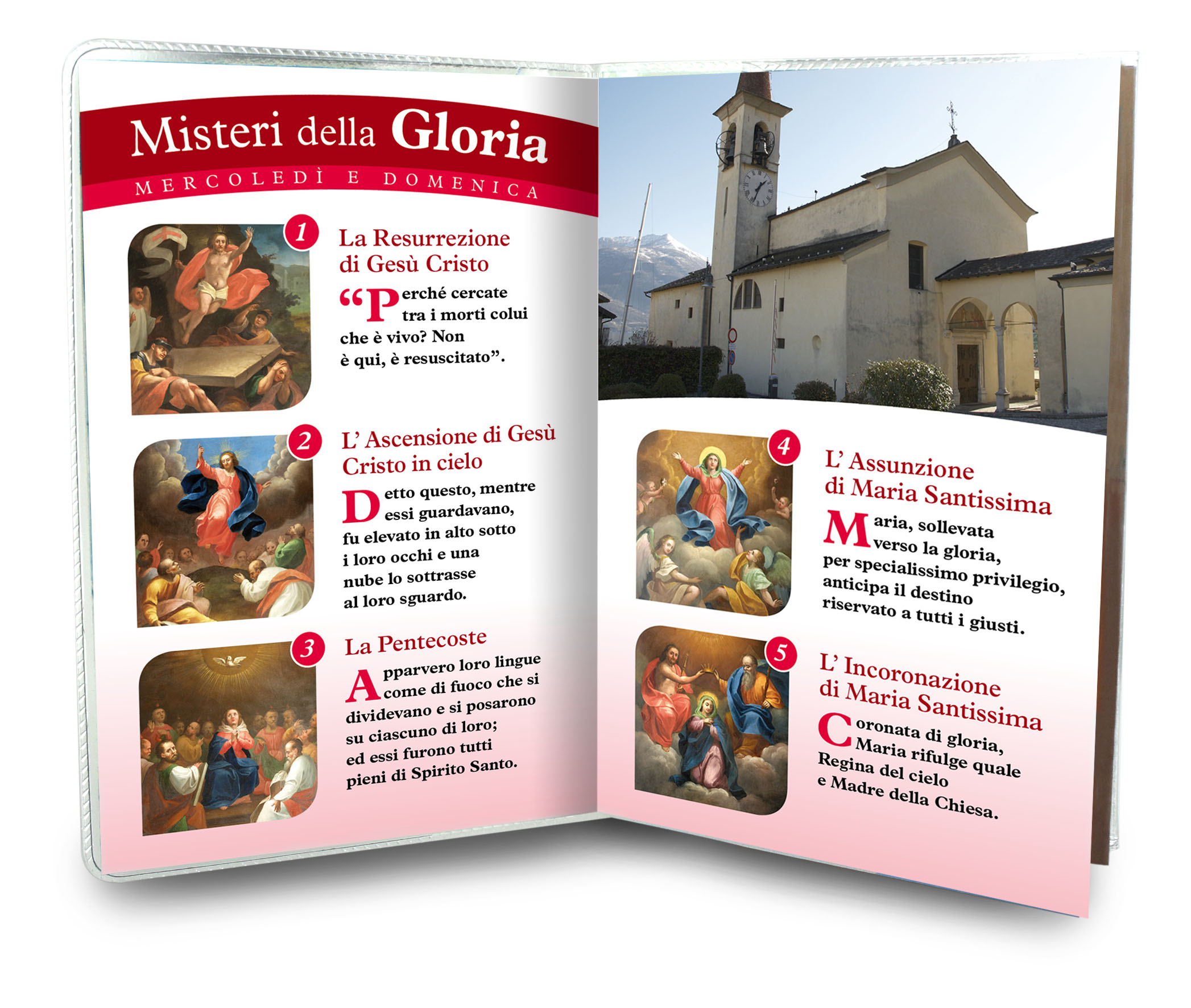 Il libretto, composto da 16 pagine, si presenta con una copertina in plastica trasparente e nell'interno vi è un piccolo rosario con i grani tipo perlina del diamero di mm 4.